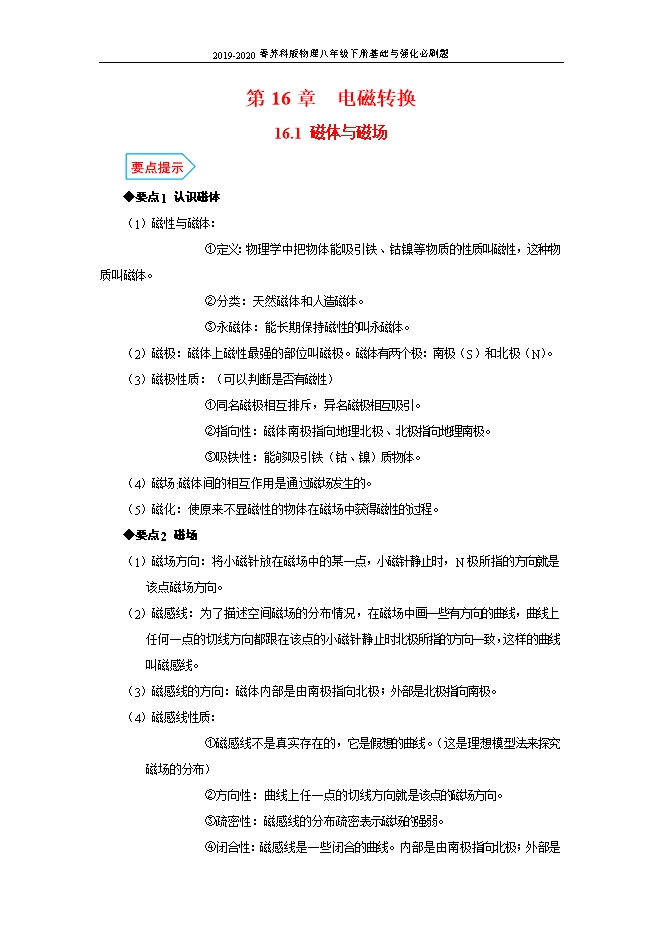 [精品]2019-2020春苏科版物理九年级下册基础与强化必刷题:16.1 磁体与磁场(原卷版和解析版)
