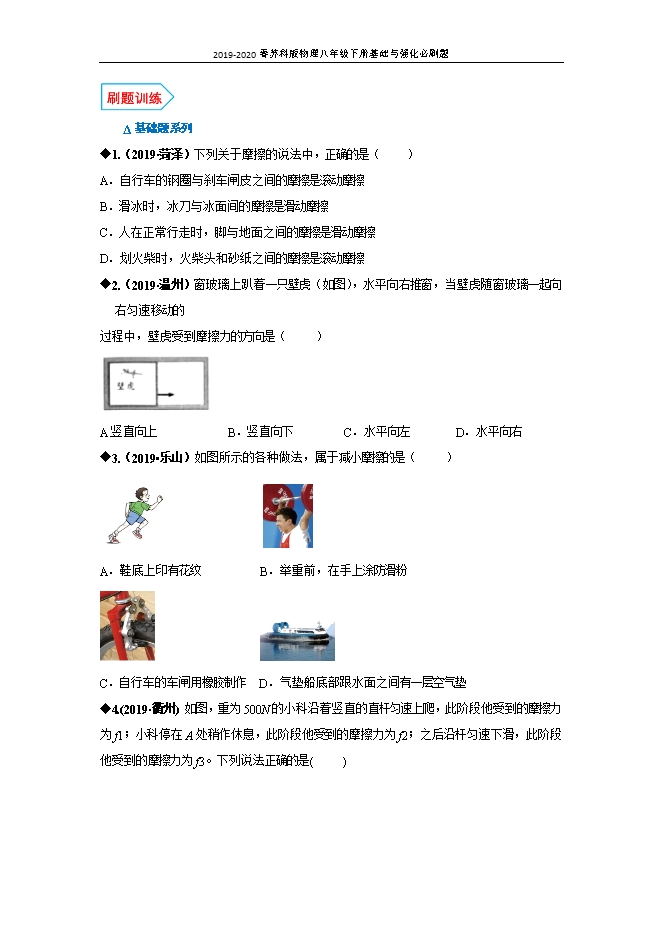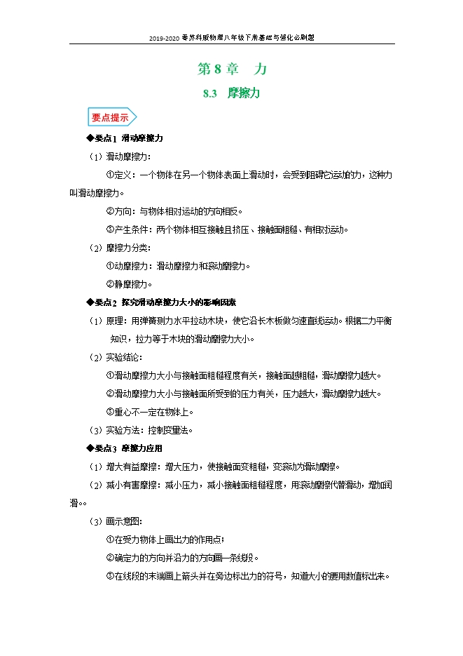 【内容简介】◆要点1 滑动摩擦力(1)滑动摩擦力: ①定义:一个物体在另一个物体表面上滑动时,会受到阻碍它运动的力,这种力叫滑动摩擦力。 ②方向:与物体相对运动的方向相反。 ③产生条件:两个物体相互接触且挤压、接触面粗糙、有相对运动。(2)摩擦力分类: ①动摩擦力:滑动摩擦力和滚动摩擦力。 ②静摩擦力。◆要点2 探究滑动摩擦力大小的影响因素(1)原理:用弹簧测力水平拉动木块,使它沿长木板做匀速直线运动。根据二力平衡知识,拉力等于木块的滑动摩擦力大小。(2)实验结论: ①滑动摩擦力大小与接触面粗糙程度有关,接触面越粗糙,滑动摩擦力越大。 ②滑动摩擦力大小与接触面所受到的压力有关,压力越大,滑动摩擦力越大。 ③重心不一定在物体上。(3)实验方法:控制变量法。◆要点3 摩擦力应用(1)增大有益摩擦:增大压力,使接触面变粗糙,变滚动为滑动摩擦。(2)减小有害摩擦:减小压力,减小接触面粗糙程度,用滚动摩擦代替滑动,增加润滑。。(3)画示意图: ①在受力物体上画出力的作用点; ②确定力的方向并沿力的方向画一条线段。 ③在线段的末端画上箭头并在旁边标出力的符号,知道大小的要用数值标出来。 Δ基础题系列◆1.(2019•菏泽)下列关于摩擦的说法中,正确的是( )A.自行车的钢圈与刹车闸皮之间的摩擦是滚动摩擦B.滑冰时,冰刀与冰面间的摩擦是滑动摩擦C.人在正常行走时,脚与地面之间的摩擦是滑动摩擦D.划火柴时,火柴头和砂纸之间的摩擦是滚动摩擦【答案】B【解析】A、自行车的钢圈与刹车闸皮之间发生的是相对滑动,它们之间的摩擦是滑动摩擦,故A错误; B、滑冰时,冰刀与冰面之间发生的是相对滑动,它们之间的摩擦是滑动摩擦,故B正确; C、人在正常行走时,脚向后蹬地,与地面之间有相对运动的趋势,脚与地面间的摩擦是静摩擦,故C错误; D、划火柴时,火柴头和砂纸之间发生的是相对滑动,它们之间的摩擦是滑动摩擦,故D错误。 故选:B。◆2.(2019•温州)窗玻璃上趴着一只壁虎(如图),水平向右推窗,当壁虎随窗玻璃一起向右匀速移动的过程中,壁虎受到摩擦力的方向是( ) A.竖直向上B.竖直向下C.水平向左D.水平向右【答案】A【解析】壁虎随着玻璃一起运动,但是壁虎和玻璃之间相对静止,壁虎受到平衡力的作用,从受到的力上分析摩擦力方向。解:当壁虎随窗玻璃一起向右匀速移动的过程中,壁虎和玻璃之间相对静止的,壁虎受到平衡力的作用,竖直方向上壁虎受到重力和摩擦力的作用,重力的方向竖直向下,摩擦力的方向竖直向上。◆3.(2019•乐山)如图所示的各种做法,属于减小摩擦的是( ) A.鞋底上印有花纹 B.举重前,在手上涂防滑粉 C.自行车的车闸用橡胶制作 D.气垫船底部跟水面之间有一层空气垫【答案】D【解析】A、鞋底上印有花纹,是在压力一定时,通过增大接触面的粗糙程度来增大摩擦力,故A不合题意;B、举重前,在手上涂防滑粉,是在压力一定时,通过增大接触面的粗糙程度来增大摩擦力,故B不合题意;C、自行车的车闸用橡胶制作,是在压力一定时,通过增大接触面的粗糙程度来增大摩擦力,故C不合题意;D、气垫船底部跟水面之间有一层空气垫,是通过使接触面脱离来减小摩擦力,故D符合题意。......