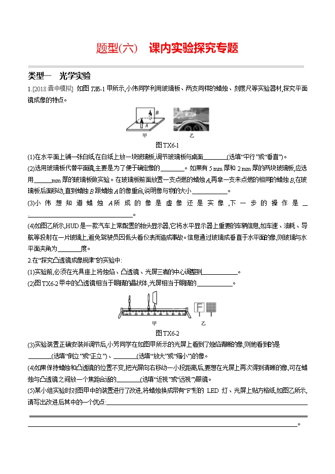【内容简介】类型一 光学实验1.[2018•晋中模拟] 如图TX6-1甲所示,小伟同学利用玻璃板、两支同样的蜡烛、刻度尺等实验器材,探究平面镜成像的特点。 图TX6-1(1)在水平面上铺一张白纸,在白纸上放一块玻璃板,调节玻璃板与桌面 (选 填“平行”或“垂直”)。 (2)选用玻璃板代替平面镜,主要是为了便于确定像的 。如果有5 mm厚和2 mm厚的两块玻璃板,应选用 mm厚的玻璃板做实验。在玻璃板前面放置一支点燃的蜡烛A,再拿一支未点燃的相同的蜡烛B,在玻璃板后面移动,直到蜡烛B跟蜡烛A的像重合,说明像与物的大小 。 (3)小伟想知道蜡烛A所成的像是虚像还是实像,下一步的操作是 。 (4)如图乙所示,HUD是一款汽车上常配置的抬头显示器,它将水平显示器上重要的车辆信息,如车速、油耗、导航等投射在一片玻璃上,避免驾驶员因低头看仪表而造成事故。信息通过玻璃成垂直于水平面的像,则玻璃与水平面夹角为 度。 2.在“探究凸透镜成像规律”的实验中:(1)实验前,必须在光具座上将烛焰、凸透镜、光屏三者的中心调整到 。 (2)图TX6-2甲中的凸透镜相当于眼睛的晶状体,光屏相当于眼睛的 。 图TX6-2(3)实验装置正确安装并调节后,小芳同学在如图甲所示的光屏上看到了烛焰清晰的像,则她看到的是 (选填“倒立”或“正立”)、 (选填“放大”或“缩小”)的像。 (4)如果保持蜡烛和凸透镜的位置不变,把光屏向右移动一小段距离后,要想在光屏上再次得到清晰的像,可在蜡烛与凸透镜之间放一个焦距合适的 (选填“近视”或“远视”)眼镜。 (5)某小组实验时对图甲中的装置进行了改进,将蜡烛换成带有“F”形的 LED 灯、光屏上贴方格纸,如图乙所示,请写出改进后其中的一个优点: (6)为了方便从不同角度观察光屏上的像,光屏应选用较 (选填“粗糙”或“光滑”)的玻璃板。 类型二 热学实验3.生活中处处有物理,小明在生活中发现:随着气温升 高,放在口袋中的巧克力变软了,以上现象引发了他的猜想:巧克力可能是非晶体。于是他采用图TX6-3甲所示的装置进行了以下探究: 图TX6-3(1)把石棉网垫在烧杯下,并将试管放在水中加热,这是为了使巧克力受热 ,而且巧克力的温度上升 速度较 ,便于及时记录各个时刻的温度。 (2)除图甲所示实验器材外,还需要的测量仪器有 。 (3)实验中,应始终注意观察试管中巧克力 的变化,并每隔0.5 min记录一次温度计的示数。 (4)某时刻温度计的示数如图乙所示,此时的温度是 ℃,这个温度值 (选填“能”或“不能”)在体温计上显示。 (5)根据实验记录的数据,小明在坐标纸上画出了巧克力熔化过程中的温度-时间图像。(6)若猜想正确,则他所画的图像与图TX6-4中的 相符。 图TX6-44.小怡和小薇分别利用如图TX6-5甲所示的实验装置探究水沸腾时温度变化的特点,并绘制出如图乙所示的水的温度随时间变化的图像。 图TX6-5(1)实验时,小怡在加热到第3 min时,看到水中有大量气泡不断上升并变 ,到水面破裂开来,里面的水蒸气散发到空气中,就表明水沸腾了,且此时温度 。 (2)小怡在第9 min撤掉酒精灯后,水停止了沸腾,此现象说明水沸腾时必须 。 (3)分析图乙可知,小薇将水加热至沸腾的时间较长,可能的原因是 。 (4)接着,小怡与小薇又设计了如图丙所示的实验。观察发现铁片 (填序号)内侧出现了水珠,说明 是使气体液化的一种方式;一段时间后,铁片2比铁片1的温度 ,说明 。 5.在“比较不同物质吸热的情况”实验中,实验装置如图TX6-6所示。.........