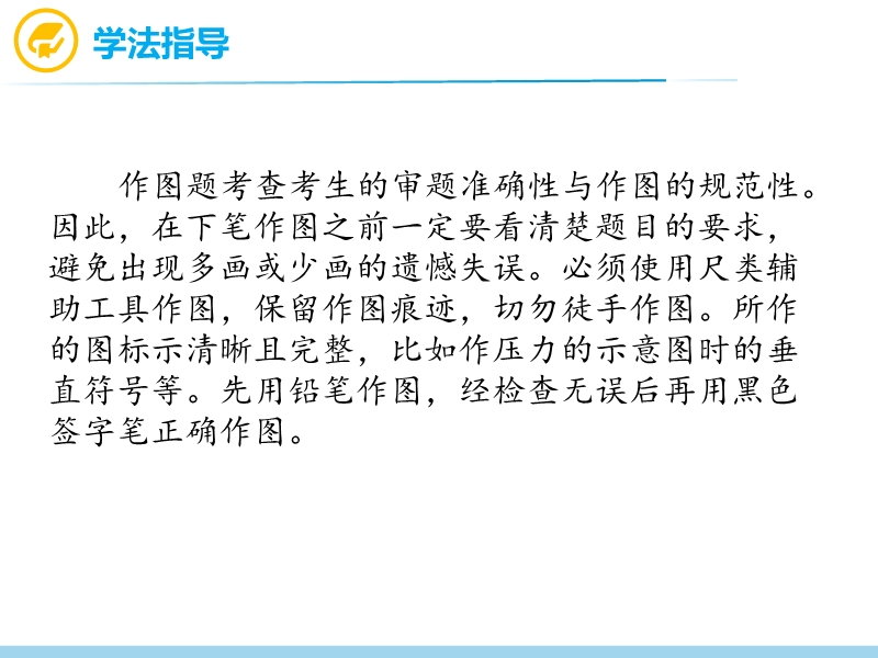 【内容简介】中考作图题通常分为光学作图、电和磁的作图、力学作图。其中,光学作图包括反射现象光路图、平面镜成像光路图、折射现象光路图、透镜折射光路图等;电和磁的作图包括根据实物图画电路图、根据电路图给实物图连线、设计电路图、确定通电螺线管的电流方向、磁极方向或者绕线方向等;力学作图则包括物体受力的示意图、杠杆的受力和力臂、滑轮组的绕线等。作图题考查考生的审题准确性与作图的规范性。因此,在下笔作图之前一定要看清楚题目的要求,避免出现多画或少画的遗憾失误。必须使用尺类辅助工具作图,保留作图痕迹,切勿徒手作图。所作的图标示清晰且完整,比如作压力的示意图时的垂直符号等。先用铅笔作图,经检查无误后再用黑色签字笔正确作图。如图23-1,一物体以某一速度冲上表面粗糙的固定斜面,请画出该物体在上滑过程中所受的力的示意图。(力的作用点画在物体的重心)