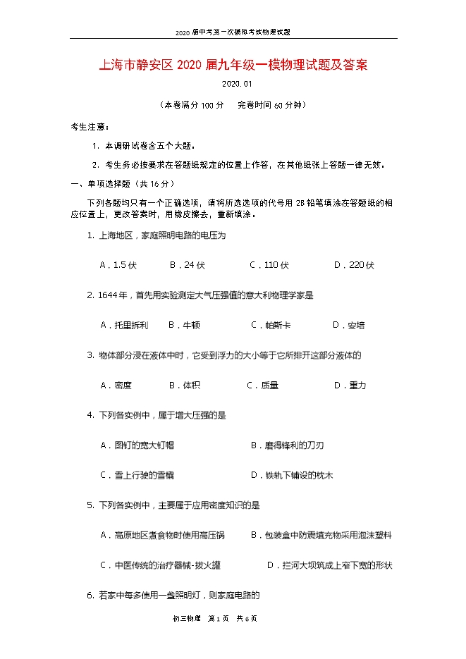 - 下一份试卷:上海市黄浦区2020届九年级一模物理试题及答案