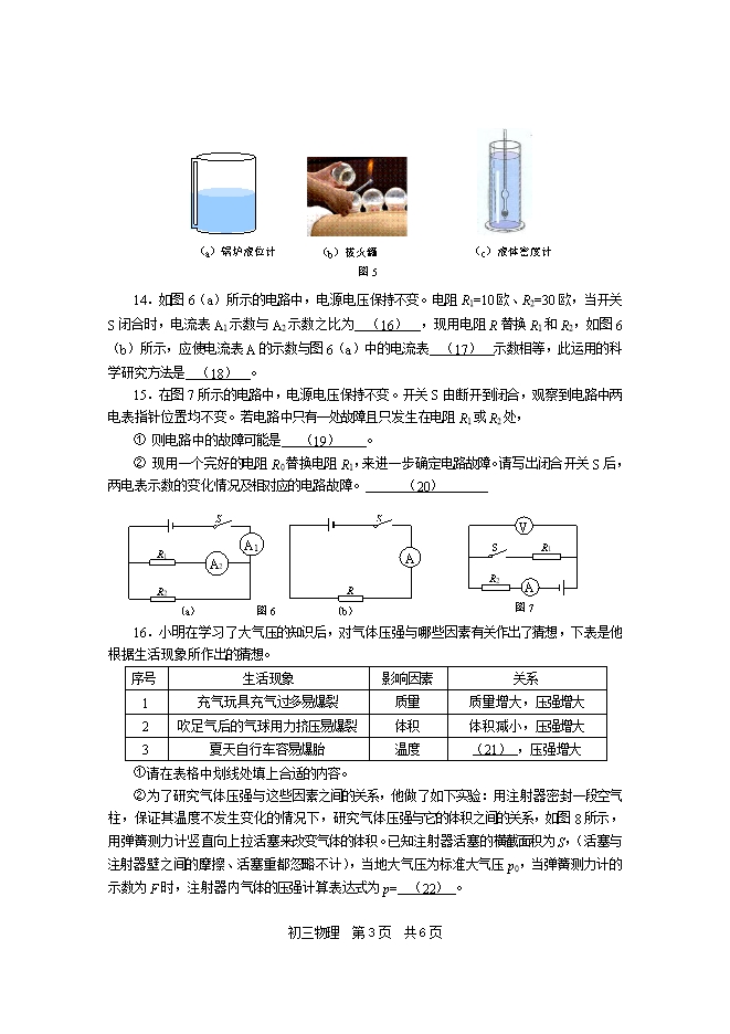 【内容简介】下列各题均只有一个正确选项,请将正确选项的代号用2B铅笔填涂在答题纸的相应位置上,更改答案时,用橡皮擦去,重新填涂。1.将一根粗细均匀的金属丝剪去一半后,不变的物理量是 A.电阻 B.密度 C.体积 D. 质量2.图1所示的四个实例中,为了减小压强的3.首先测定大气压强值的科学家是A.阿基米德B.牛顿C.托里拆利D.帕斯卡4.如图2所示,为保证驾驶员的安全,轿车上设有安全带提示系统。当驾驶员坐在座椅上时,座椅下的开关S1闭合、S2断开,指示灯L亮起;当驾驶员系上安全带时,开关S2闭合,指示灯L熄灭。在图2所示的各电路中,符合上述要求的是5.分别浸没在水和盐水中的实心铝球和铜球(已知ρ铝<ρ铜,ρ水<ρ盐水),它们所受浮力相等,则它们体积的大小关系为A.铝球大B.铜球大C.大小相等D.无法确定6.甲、乙是由同种材料制成且横截面积相等的两导体,若将它们串联在电路中,则关于甲、乙的长度L及两端的电压U的大小关系判断正确的是A.若L甲;L乙,则U甲;U乙B.若L甲;L乙,则U甲=U乙 C.若L甲;L乙,则U甲;U乙D.若L甲;L乙,则U甲;U乙 7.在图3所示的电路中,电源电压保持不变。闭合开关S,滑动变阻器滑片P向右移动的过程中,下列数值一定变大的是A.电压表V的示数B.电流表A2的示数C.电流表A2与电流表A1示数的比值D.电压表V与电流表A示数的比值8.如图4所示,均匀正方体甲、乙置于水平地面上,它们对水平地面的压强相等,若在两个正方体的上部,沿水平方向分别截去相同高度,则关于甲、乙的密度ρ甲、ρ乙和对地面压力变化量的判断,正确的是A.ρ甲>ρ乙,⊿F甲<⊿F乙 B.ρ甲>ρ乙,⊿F甲>⊿F乙C.ρ甲<ρ乙,⊿F甲<⊿F乙 D.ρ甲<ρ乙,⊿F甲>⊿F乙二、填空题(共26分)请将结果填入答题纸的相应位置。9.上海地区家庭电路的电压为 (1) 伏,电视机与空调是 (2) 连接的(选填“串联”或“并联”),同时使用的用电器越多,电路中总电阻越(3) 。10.10秒钟通过某导体横截面的电荷量为6库,则通过它的电流为 (4) 安,若导体电阻为10欧,则它两端电压为 (5) 伏;若该导体两端电压变为10伏,此时5秒钟通过该导体横截面的电荷量为(6) 库。11.著名的 (7) 实验向人们展示了大气压存在且很大,海拔高度越高,大气压越 (8) 。能达万米深处的“蛟龙”号深潜器的形状和构造必须能承受水下很大的 (9) 。12.冰的密度为0.9×103千克/米3,表示每立方米冰的 (10) 。质量为2千克的水,其体积为 (11) 米3,若它完全结成冰之后,不变的是 (12) 。13.物理知识在生活中有广泛的应用,如图5(a)所示的装置是利用 (13) 原理工作的;如图5(b)所示的装置是利用了(14) 的知识;如图5(c)所示的仪器是利用二力平衡和(15) 原理来判断液体密度大小。