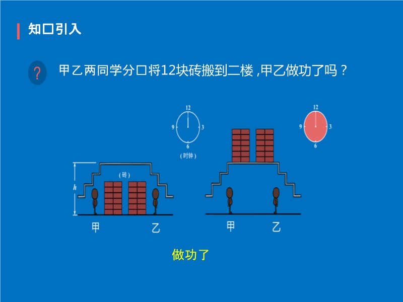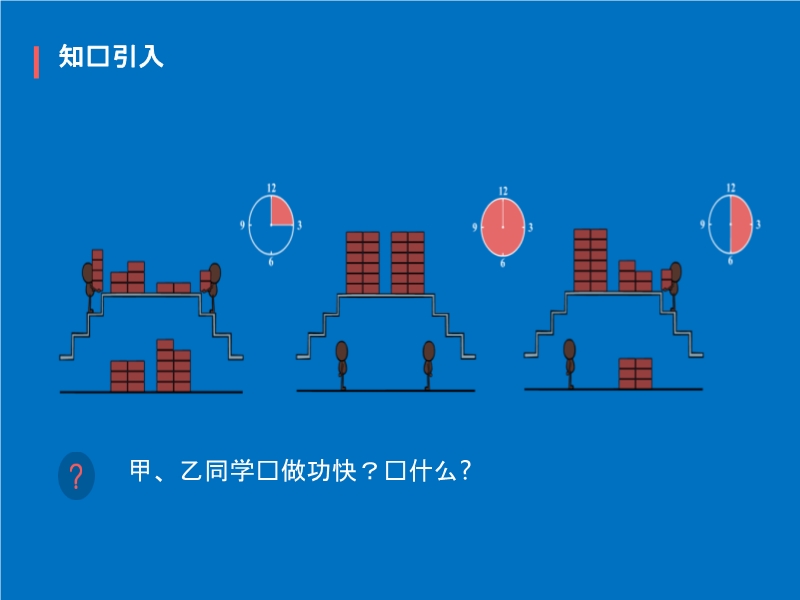 【内容简介】知道功率。能说出功率的物理意义,并能写出功率的定义式 及其单位。 能结合生活中的实例说明功率的含义。 能应用功率的定义式进行简单计算,并能利用功率的概念设计测量生活中功率的大小。 比较做功快慢的方法功与时间之比叫做功率P,数值上等于单位时间内所做的功。 使用机械做功时,下面说法正确的( )(A)功率大的机器一定比功率小的机器做功多;(B)功率大的机器一定比功率小的机器做功时间少;(C)功率小的机器一定比功率大的机器做功慢;(D)以上说法都不对.