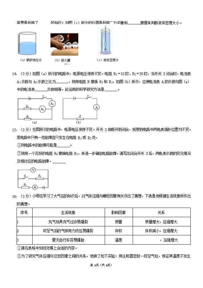 【内容简介】一、选择题(共16分) 1.(3分)将一根粗细均匀的金属丝剪去一半后,不变的物理量是() A.电阻B.密度C.体积D.质量 2.(3分)如图所示四个实例中,为了减小压强的是() A.盲道上凸起的圆点B.菜刀刃很锋利C.注射器针头做很尖细D.坦克装有宽大的履带 3.(3分)首先测定大气压强值的科学家是() A.阿基米德B.牛顿C.托里拆利D.帕斯卡 4.(3分)如图所示,为保证驾驶员的安全,轿车上设有安全带提示系统。当驾驶员坐在座椅上时,座椅下的电键S1闭合、电键S2断开,指示灯L亮起;当驾驶员系上安全带时,电键S2闭合,指示灯L熄灭,在如图所示的各电路中,符合上述要求的是() 5.(3分)分别浸没在水和盐水中的实心铝球和铜球(已知ρ铝<ρ铜,ρ水<ρ盐水),它们所受浮力相等,则它们体积的大小关系为() A.铝球大B.铜球大C.大小相等D.无法确定 6.(3分)甲、乙是由同种材料制成且横截面积相等的两导体,若将它们串联在电路中,则关于甲、乙的长度L及两端的电压U的大小关系判断正确的是() A.若L甲>L乙,则U甲<U乙B.若L甲<L乙,则U甲=U乙 C.若L甲<L乙,则U甲>U乙D.若L甲>L乙,则U甲>U乙 7.(3分)在如图所示的电路中,电源电压保持不变。闭合开关S,滑动变阻器滑片P向右移动的过程中,下列数值一定变大的是().........
