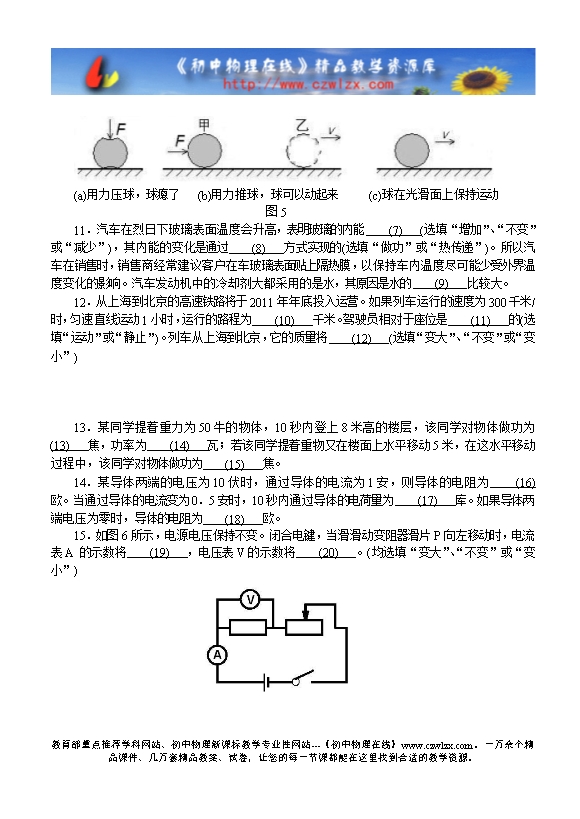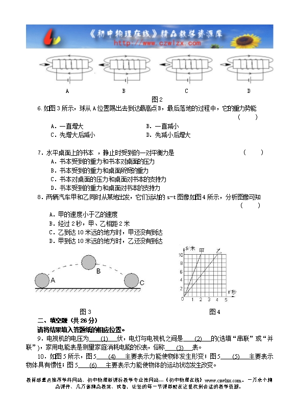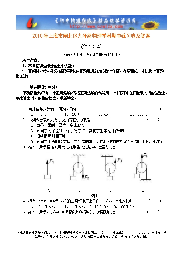 2010年上海市闸北区九年级物理学科期中练习卷及答案