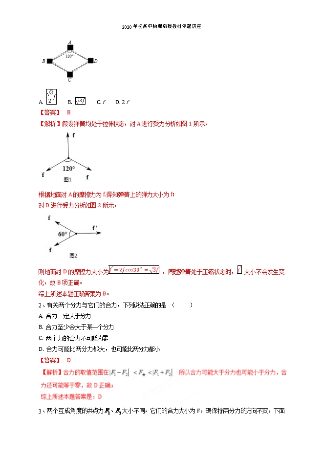 【内容简介】1.理解合力、分力、力的合成、力的分解等的概念.2.掌握平行四边形定则,会用平行四边形定则求合力和分力,理解力的合成和力的分解本质上是从作用效果相等的角度进行力的相互替代.3.理解共点力作用下物体平衡状态的概念,能推导出共点力作用下物体的平衡条件,会用共点力平衡条件解决有关力的平衡问题.二、学习要点:1、合力、分力、力的合成、力的分解;2、力的平行四边形定则;3、共点力作用下物体的平衡条件衔接点1力的合成【基础知识梳理】同学们仔细观察会发现,一位力气大的同学只用一只手一个力就可以把水桶从地面提到桌面上,两个女同学用两只手给水桶两个力,同样也把水桶从地面移动到桌面上,不同的同学用不同的方法达到了一个共同的目的.在提水桶这个事件上,这一个力产生的作用效果和两个力的作用效果是相同的合力和分力的定义:当一个物体受到几个力共同作用时,我们常常可以求出这样一个力,这个力的作用效果跟原来几个力的作用效果相同,这个力就叫做那几个力的合力;原来的那几个力叫做分力。力的合成的定义:求几个力合力的过程叫做力的合成力的平行四边形定则:以表示两个分力的线段为邻边作一个平行四边形,则这个平行四边形中表示两分力的线段所夹的对角线表示合力的大小和方向.名师点睛:1、两个分力大小不变的情况下,合力随夹角的变大而变小,随夹角的变小而变大;当两个分力之间的夹角为0°时两个力的合力最大,最大值为二力之和;当两个分力之间的夹角为180°两个力的合力最小,最小值为二力之差.(1)当Ө=0°时,F=F1+F2,合力F与分力F1、F2同向.(2)当Ө=180°时,F=|F1一F2|,合力F与分力F1、F2中较大的力同向.(3)合力F的取值范围,|F1一F2|≤F≤F1+F2.(4)夹角Ө越大,合力就越小.(5)合力可能大于每一个分力,也可能小于每一个分力,还可能大于一个分力而小于另一个分力.2、求三个或三个以上共点力的合力时,可先求出任意两个力的合力,再求出此合力跟第三个力的总合力,以此类推,直到求完为止。【典例引路剖析】【例题1】如图所示,设有五个力同时作用在质点 上,它们的大小和方向相当于正六边形的两条边和三条对角线.这五个力中的最小力的在小为 ,则这五个力的合力等于( ) A. B. C. D. 【答案】 D【解析】如图, 与 的合力与 同向;同时 与 的合力也与 同向;故分别将 与 合成, 与 合成,最终 的合力为 .因为 ,由几何关系知 ,则总合力 ,D正确. 【例题2】作用在同一个物体上的两个共点力,一个力的大小是 ,另一个力的大小是 ,它们合力的大小可能是( )A. B. C. D. 【答案】 C 点睛:分力一定时求两力合成时,合力随夹角的增大而减小,当夹角为零时合力最大,夹角180°时合力最小,并且 。【变式训练】1、如图所示,在粗糙水平面上放置A、B、C、D四个小物块,各小物块之间由四根完全相同的轻弹簧相互连接,正好组成一个菱形,∠BAD=120°,整个系统保持静止状态.已知A物块所受的摩擦力大小为f,则D物块所受的摩擦力大小为: