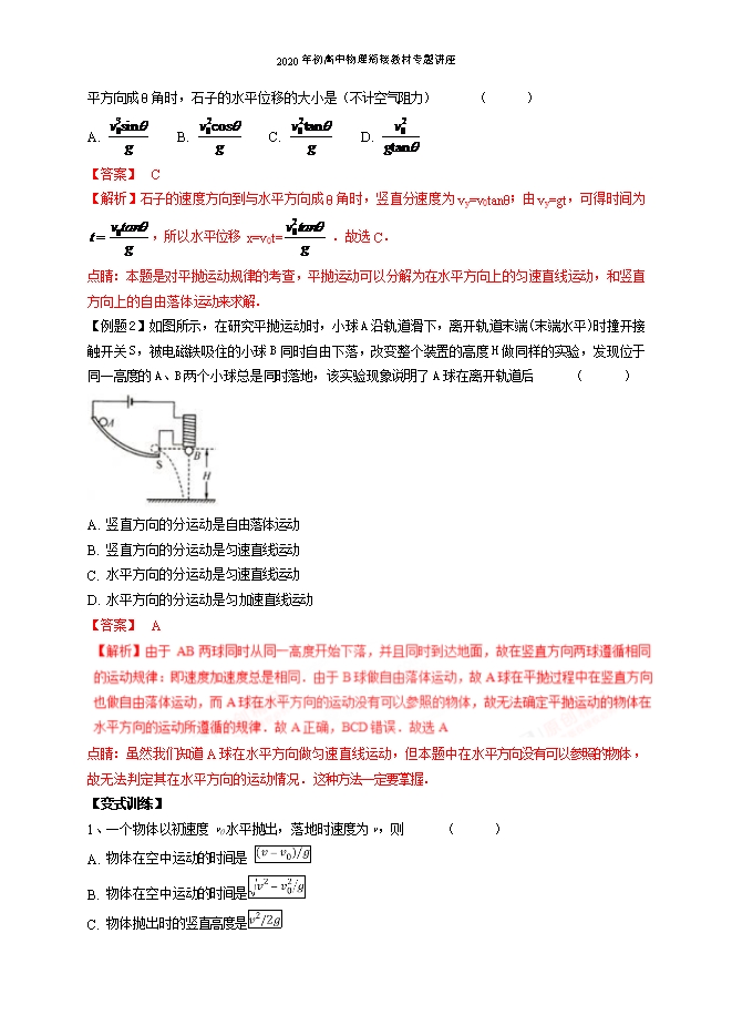 【内容简介】一、学习目标:1、知道平抛运动的运动轨迹是抛物线;2、知道平抛运动形成的条件;3、理解平抛运动是匀变速曲线运动,其加速度为g;4、会用平抛运动规律解答有关问题二、学习要点:平抛运动的特点和规律衔接点1平抛运动【基础知识梳理】1、平抛运动水平方向的运动规律研究完竖直方向上的运动,我们再来看水平方向上的分运动。先来分析做平抛运动的物体在水平方向上的受力情况。(做平抛运动的物体只受重力作用,重力的方向是竖直向下的,所以物体在水平方向上不受力)根据运动的独立性我们知道水平方向上的运动不会受到竖直方向的运动影响,再根据牛顿第一定律我们能得出什么样的结论啊?(根据牛顿第一定律我们知道,如果一个物体处于不受力或受力平衡状态,它将静止或做匀速直线运动。在平抛运动中,物体水平方向上不受力,并且水平方向上有一个初速度,所以物体在水平方向上应该是匀速直线运动。)结论:平抛运动的水平分运动是匀速直线运动。2、平抛运动竖直方向的运动规律现在请大家来分析做平抛运动的物体在竖直方向上的受力情况?(在竖直方向上只受到重力的作用)想一下我们前面学过的运动形式有没有只在重力作用下实现的?(做自由落体运动的物体只受重力的作用)既然竖直方向上只受重力的作用,与物体做自由落体运动的条件相同,根据我们上节课学的分运动的独立性原理知道,分运动在各自的方向上遵循各自的规律,我们能得出什么样的结论呢?(平抛运动竖直方向上的分运动有可能是自由落体运动)结论:平抛运动在竖直方向上的分运动是自由落体运动。【典例引路剖析】【例题1】在地面上方某一高处,以初速度v0水平抛出一石子,当它的速度由水平方向变化到与水平方向成θ角时,石子的水平位移的大小是(不计空气阻力) ( )A. B. C. D. 【答案】 C【解析】石子的速度方向到与水平方向成θ角时,竖直分速度为vy=v0tanθ;由vy=gt,可得时间为 ,所以水平位移 x=v0t= .故选C.点睛:本题是对平抛运动规律的考查,平抛运动可以分解为在水平方向上的匀速直线运动,和竖直方向上的自由落体运动来求解.【例题2】如图所示,在研究平抛运动时,小球A沿轨道滑下,离开轨道末端(末端水平)时撞开接触开关S,被电磁铁吸住的小球B同时自由下落,改变整个装置的高度H做同样的实验,发现位于同一高度的A、B两个小球总是同时落地,该实验现象说明了A球在离开轨道后 ( ) A. 竖直方向的分运动是自由落体运动B. 竖直方向的分运动是匀速直线运动C. 水平方向的分运动是匀速直线运动D. 水平方向的分运动是匀加速直线运动【答案】 A点睛:虽然我们知道A球在水平方向做匀速直线运动,但本题中在水平方向没有可以参照的物体,故无法判定其在水平方向的运动情况.这种方法一定要掌握...........