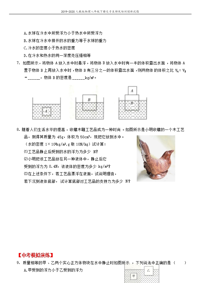 【内容简介】【知识点一 物体的浮沉条件】1. 黄花梨是著名名贵的木材,用它制作成的手串,气味芳香,很受大众喜爱。有一个用质量为40g的用海南西部黄花梨制成的手串,体积为39cm3,将它放在足够大的水杯中静止后它将( )A.漂浮在水面上B.下沉到水底C.悬浮在水中任何深度D.无法判断 2. 俗话说“瓜浮李沉”,意思是西瓜投入水中会漂浮,李子投入水中会下沉。对此现象,下列说法正确是是( )A.西瓜所受的浮力大于李子所受的浮力B.李子下沉过程中所受的浮力逐渐变小C.西瓜漂浮时所受的浮力大于自身重力D.李子下沉过程中受到的浮力大于重力3. 把体积为2×10-3m3、重为12N的物块放入水中,当它静止时所处的状态及受到的浮力大小分别为(g取10N/kg)A.漂浮,F浮=20NB.漂浮,F浮=12NC.沉底,F浮=20ND.沉底,F浮=12N【知识点二 浮力的应用】4. 圆柱体先后放入密度为ρ1和ρ2的两种液体中,均处于漂浮状态,如图所示。圆柱体在两液体中所受浮力依次是F1和F2,则( )A.ρ1>ρ2 F1>F2B.ρ1<ρ2 F1<F2C.ρ1<ρ2 F1=F2D.ρ1>ρ2 F1=F2 【能力提升精练】5. 肥桃又叫佛桃,是山东泰安肥城的特产。肥城不仅肥桃闻名,桃木雕刻也是首屈一指的。将两个相同的心形雕刻分别放在不同液体中,静止后情形如图所示,若它们受到的浮力分别为F甲、F乙,杯底受到的压强分别为p甲、p乙,则它们的关系为( )A.F甲=F乙,p甲=p乙B. F甲;F乙,p甲;p乙C. F甲=F乙,p甲;p乙D. F甲;F乙,p甲=p乙6. 小亮同学利用气球和圆柱形水杯做了一个小实验。在气球内灌入一定量的水封口制成水球(如图甲)。先将水球放入冷水中,水球漂浮(如图乙)。把杯中冷水换成热水,再次把水球放入热水中,发现水球沉在杯底(如图丙)。下列分析正确的是( )A.水球在冷水中所受浮力小于热水中所受浮力B.水球在冷水中排开的水的重力等于水球的重力C.冷水的密度小于热水的密度D.在冷水和热水的同一深度处压强相等7. 如图所示,将物体A放入水中时悬浮,将物体B放入水中时有一半的体积露出水面,将物体A置于物体B上再放入水中时,物体B有三分之一的体积露出水面,则两物体的体积之比VA∶VB=______,物体B的密度是______kg/m3。8. 随着人们生活水平的提高,收藏木雕工艺品成为一种时尚。如图所示是小明收藏的一个木工艺品,测得其质量为45g,体积为50cm3,现把它放到水中。(水的密度1×103kg/m3,g取10N/kg)试计算:⑴工艺品静止后受到的水的浮力为多少N?⑵小明把该工艺品放在另一种液体中,静止后它受到的浮力为0.4N,该液体的密度为多少kg/m3?⑶在上述条件下,若工艺品漂浮在液面,试说明理由,若下沉到液体底部,试计算底部对工艺品的支持力为多少N?
