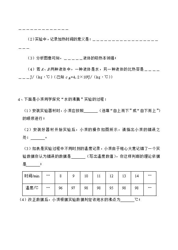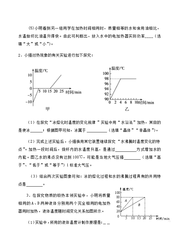 【内容简介】1.在实验课上,为比较不同物质吸热的情况,各实验小组用如图所示的实验装置完成实验。(实验过程中水和食用油的温度均未达到沸点) (1)小明设计的实验表格如下,在表格中横线处补全缺少的项目。物质质量/kg初温/℃升高的温度/℃加热时间/min水食用油 (2)为了测量水和食用油的质量,小明先将天平放在____桌面上,再用调好的天平测出质量相等的水和食用油。 (3)在实验中,小明选用了相同的电加热器。加热时间越长,物质吸收的热量越____。 (4)小明通过实验发现在加热时间相同时,食用油的温度变化较大。根据这个现象可知:水和食用油相比较,____的吸热能力强。 (5)小明看到另一组同学在加热时间相同时,质量相等的水和食用油相比,水温始终比油温升得快。由此可判断出,放入水中的电加热器实际功率____(选填“大”或“小”)。2.小强对热现象的有关实验进行如下探究: (1)在探究“冰熔化时温度的变化规律”实验中用“水浴法”加热,其目的是使冰;根据图甲可知,冰属于(选填“晶体”“非晶体”)。(2)完成上述实验后,小强换用其它装置继续探究“水沸腾时温度变化的特点”。加热一段时间后,烧杯内的水温度升高,是通过方式增加水的内能。图乙水的沸点没有达到100℃,可能是当地大气压强(选填“高于”、“低于”或“等于”)1标准大气压。(3)结合两次实验图象可知:冰的熔化过程和水的沸腾过程具有的共同特点是。3.在探究物质的吸热本领实验中,小明将质量相同的A、B两种液体分别用两个完全相同的电加热器同时加热,液体温度随时间变化关系如图所示。(1)实验中,所用的液体温度计制作原理是:_______________(2)实验中,记录加热时间的意义是:____________________(3)分析图像可知,_____液体的吸热本领强;(4)若A、B两种液体中,一种液体是水,另一种液体的比热容是_______J/(kg•℃)(己知c水=4.2×103J/(kg•℃))