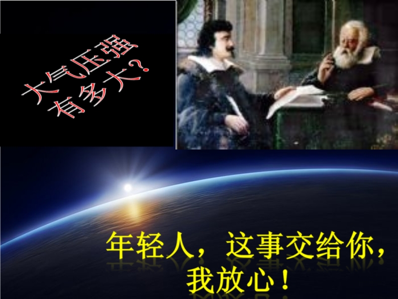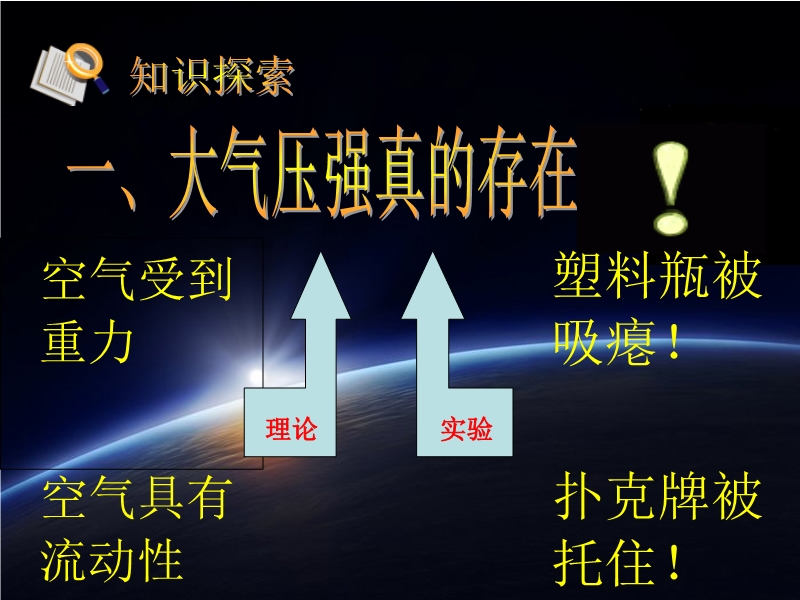 【内容简介】一、大气压强存在且很大,和液体压强相似,大气压强指向各个方向。二、托里拆利实验:一标准大气压=1.0X105Pa。