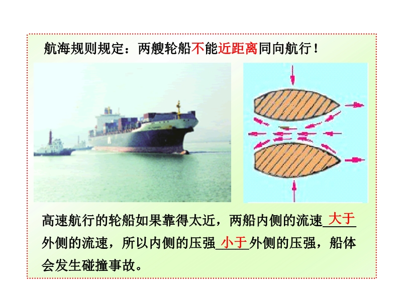 【内容简介】问题1:在火车的站台上,标有一道平行于铁轨的黄色的安全线。当列车驶过时,不允许旅客站在这条线内,以保证人体与铁轨离开足够的距离;你知道这是为什么吗?答:当列车驶进站台时,会带动人和车之间的空气流动速度加快,此时人外侧的空气流动速度慢;根据流体压强与流速的关系可知,人外侧空气流速慢压强大,而内侧流速快压强小,会产生一个向内侧的压强差,将人推向火车,易出现危险。