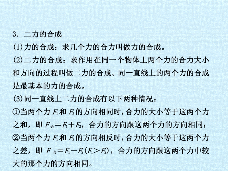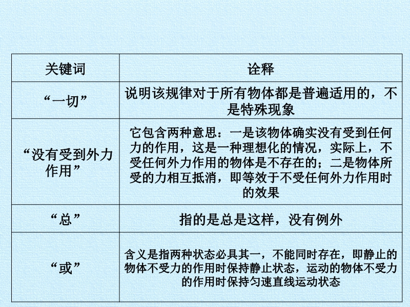 【内容简介】(1)内容:一切物体在没有受到外力作用的时候,总保持静止状态或匀速直线运动状态,这就是牛顿第一定律。(2)对牛顿第一定律的理解。2.惯性(1)定义:物体保持原来运动状态或静止状态不变的性质叫做惯性。(2)惯性大小的决定因素:惯性是由物体质量决定的,质量越大,惯性越大,与外力、运动状态无关。(3)对惯性的理解。[注意] 牛顿第一定律是在大量经验事实的基础上,经过进一步的推理而概括出来的,因此牛顿第一定律无法用实验直接来验证;牛顿第一定律揭示了力是改变物体运动状态的原因,而不是维持物体运动状态的原因。4.二力平衡(1)力的平衡:物体在受到几个力作用时,若这几个力的作用效果相互抵消,相当于物体不受力,我们就说这几个力平衡,或者说物体受到平衡力的作用。物体在受平衡力作用下的状态叫平衡状态。物体处于平衡状态时,可能静止,也可能做匀速直线运动。(2)二力平衡的条件:作用在同一物体上的两个力,大小相等、方向相反、作用在同一直线上。二力平衡的条件可简记为:“同体、等大、反向、共线”。