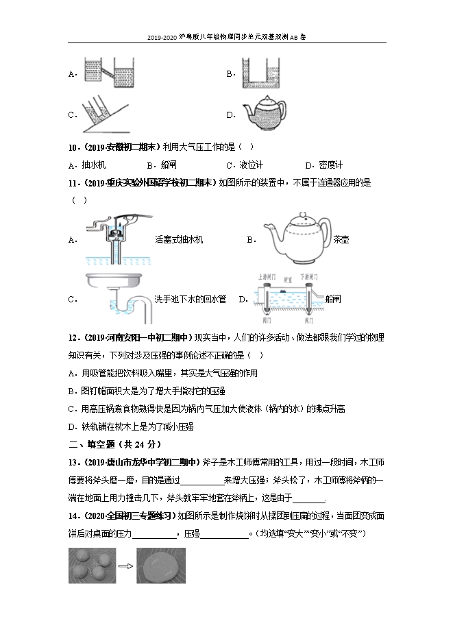 2019-2020沪粤版八年级物理同步单元双基双测AB卷:第八章 神奇的压强(B卷提升篇)