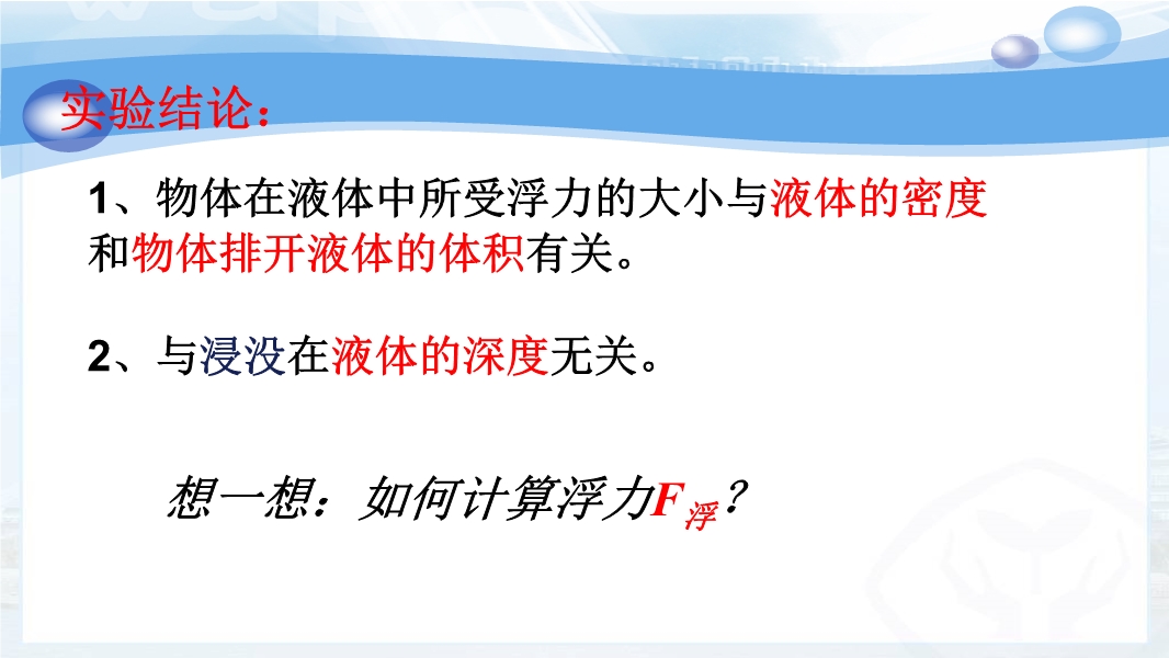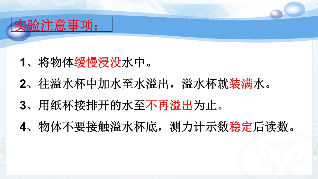 【内容简介】1、物体在液体中所受浮力的大小与液体的密度和物体排开液体的体积有关。2、与浸没在液体的深度无关。二、阿基米德原理1、将物体缓慢浸没水中。2、往溢水杯中加水至水溢出,溢水杯就装满水。3、用纸杯接排开的水至不再溢出为止。4、物体不要接触溢水杯底,测力计示数稳定后读数。1.内容:浸在液体中的物体所受的浮力, 大小等于它排开液体的重力。2.数学表达式:F浮=G排3.用于计算的导出式: F浮= G排4.适用范围:液体和气体
