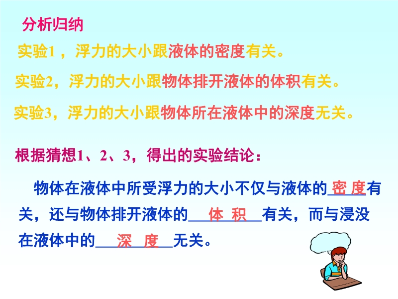 【内容简介】一、实验探究:浮力的大小与哪些因素有关?不论物体是浸没还是部分浸入在液体里都受到浮力。对于同一物体而言,浸没时受到的浮力大,部分浸入时受到的浮力小,而且浸入的体积越小,所受的浮力也越小。2、浮力的大小等于被物体排开的液体受到的重力。①.浸没时,V排=V浸=V物,此时物体所受的浮力等于排开液体的重力,即F浮=G液=ρ液gV排=ρ液gV浸=ρ液gV物②.部分浸入时, V排=V浸;V物F浮=ρ液gV排=ρ液gV浸;ρ液gV物3、同一物体浸没在不同的液体中时,由于液体的密度不同,所受的浮力也不同.1.影响浮力大小的因素: 物体在液体中所受浮力的大小不仅与液体的密度有关,还与物体排开液体的体积有关,而与浸没在液体中的深度无关。2.阿基米德原理: 浸在液体中的物体所受的浮力的大小等于被物体排开的液体所受的重力。