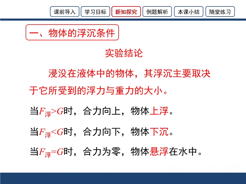 【内容简介】浸没在液体中的物体,其浮沉主要取决于它所受到的浮力与重力的大小。当F浮G时,合力向上,物体上浮。当F浮G时,合力向下,物体下沉。当F浮=G时,合力为零,物体悬浮在水中。轮船(1)工作原理:将钢铁做制成空心的轮船,可以排开更多的水,漂浮在水面上。2)排水量(m排):轮船满载时排开水的质量:F浮= m排g 而 F浮=G ∴ m船+m货= m排(3)载重线