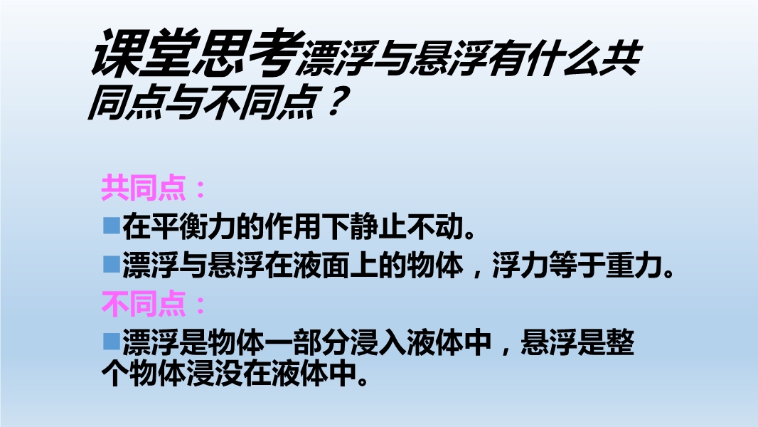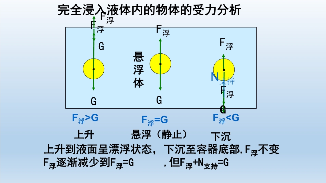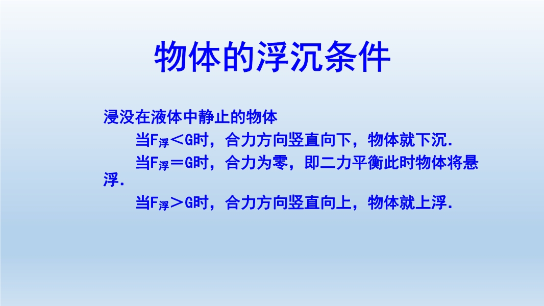 【内容简介】 阿基米德原理的内容:浮力大小等于被排开水的重力浸没在液体中静止的物体 当F浮<G时,合力方向竖直向下,物体就下沉. 当F浮=G时,合力为零,即二力平衡此时物体将悬浮. 当F浮>G时,合力方向竖直向上,物体就上浮.