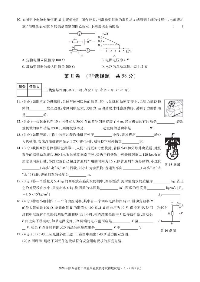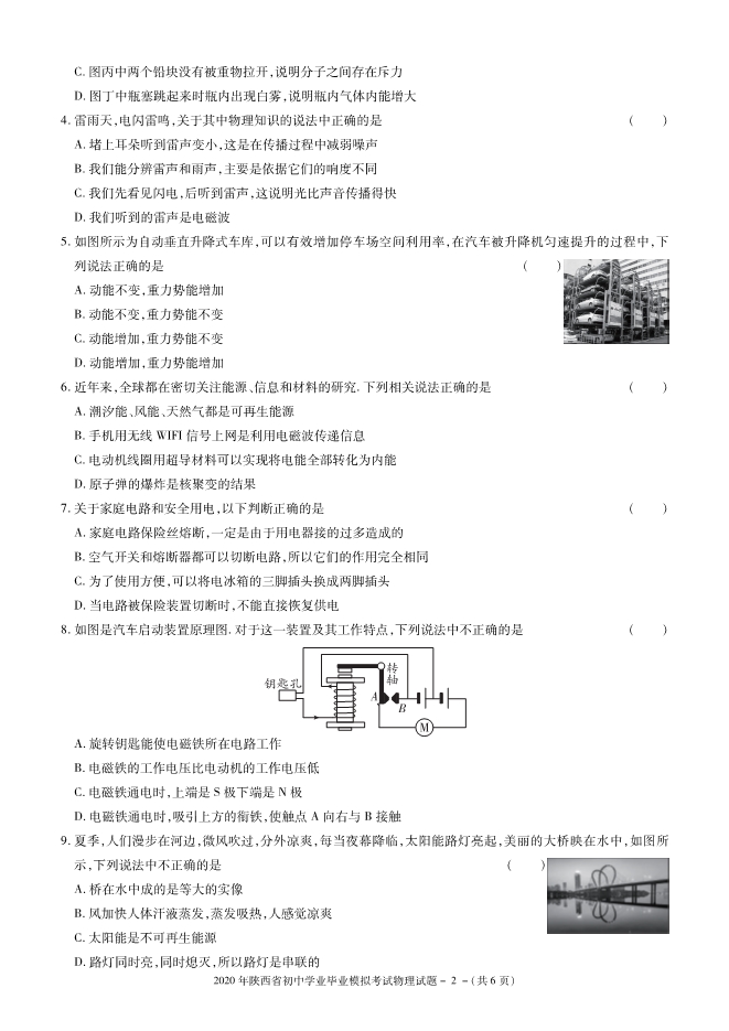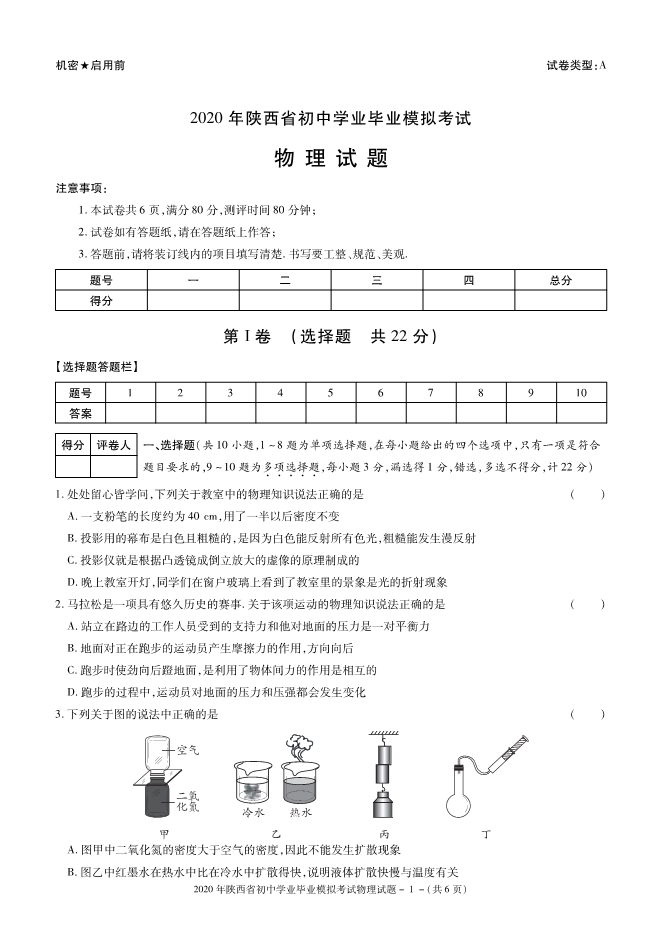 陕西省2020届九年级初中毕业学业考试模拟物理试题及答案(PDF版)