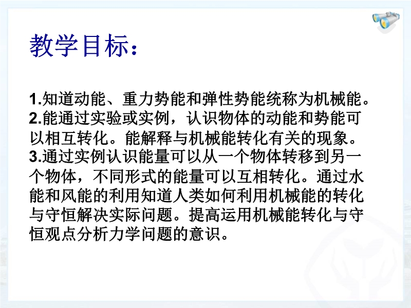 【内容简介】1.知道动能、重力势能和弹性势能统称为机械能。2.能通过实验或实例,认识物体的动能和势能可以相互转化。能解释与机械能转化有关的现象。3.通过实例认识能量可以从一个物体转移到另一个物体,不同形式的能量可以互相转化。通过水能和风能的利用知道人类如何利用机械能的转化与守恒解决实际问题。提高运用机械能转化与守恒观点分析力学问题的意识。