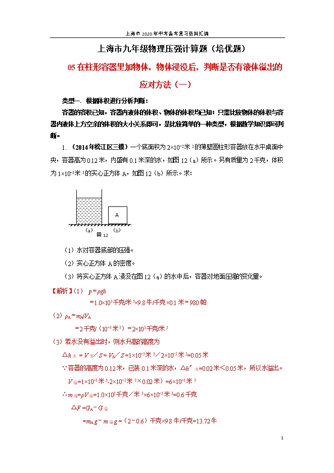 【内容简介】05在柱形容器里加物体,物体浸没后,判断是否有液体溢出的应对方法(一)类型一. 根据体积进行分析判断:容器的容积已知,容器内液体的体积、物体的体积均已知;只需比较物体的体积与容器内液体上方空余的体积的大小关系即可,是比较简单的一种类型,根据数学知识即可判断。1. (2014年松江区三模)一个底面积为2×102米2的薄壁圆柱形容器放在水平桌面中央,容器高为0.12米,内盛有0.1米深的水,如图12(a)所示。另有质量为2千克,体积为1×103米3的实心正方体A,如图12(b)所示。求: (1)水对容器底部的压强。(2)实心正方体A的密度。(3)将实心正方体A浸没在图12(a)的水中后,容器对地面压强的变化量。【解析】(1) p=ρgh =1.0×103千克/米3×9.8牛/千克×0.1米=980帕 (2)ρA=mA/VA =2千克/(103米3)=2×103千克/米3 (3)若水没有溢出时,则水升高的高度为△h水 = V排/S = VA/S =1×103米3/2×102米2=0.05米∵容器的高度为0.12米,已装0.1米深的水,△hˊ水=0.02米<0.05米,所以水溢出。 V溢=1×103米3-2×102米2×0.02米)=6×103米3∴m溢=ρV溢=1.0×103千克/米3×6×103米3=0.6千克 △F =GA-G溢=mA g-m溢g =(2-0.6)千克×9.8牛/千克=13.72牛 △p = △F/S =13.72牛/2×102米2=686帕 【答案】(1)980帕;(2)2×103千克/米3;(3)686帕。 类型二. 根据容器对水平面产生的压强(或压力)情况判断:①在薄壁柱形容器加入物体后,若满足容器对水平面压力的增加量恰好等于物体的重力ΔF地=G物,则液体没有溢出;若ΔF地<G物,则液体溢出。②在柱形容器加入物体后,若容器对水平面压强的变化量满足Δp容=ΔF/s=G物/s,则液体没有溢出;若Δp容<G物/s,则液体溢出。③在柱形容器加入物体后,计算容器对水平面的压强p容=F/s=(G物+G液)/s,与题目中所给的压强p容ˊ比较:若p容=p容ˊ,则液体没有溢出;若p容<p容ˊ,则液体溢出。 2.(2019虹口一模)如图5所示,圆柱体甲和轻质薄壁圆柱形容器乙置于水平地面。甲的质量为4千克,乙容器的底面积为2×102米2,内有0.2米深的水。 ① 求甲对地面的压力F甲。② 求水对乙容器底部的压强p水。③ 将甲浸没在乙容器的水中,容器对桌面的压强p乙为2940帕,通过计算说明容器中的水有无溢出。【解析】① F甲=G甲=m甲g=4千克×9.8牛/千克=39.2牛② p水=ρ水gh=1.0×103千克/米3×9.8牛/千克×0.2米=1960帕若水没有溢出,p乙=F/S=G总/S乙=(G水+ G甲)/S乙=(m水g+ m甲g)/S乙=ρ水gh+ m甲g/S乙=1.0×103千克/米3×9.8牛/千克×0.2米+4牛×9.8牛/千克/(2×102米2)=3920帕p乙2940帕 ,所以有水溢出。【答案】①39.2牛;② 1960帕;③有水溢出。3.(2014年嘉定区一模)质量为2千克,边长为0.1米实心正方体合金。底面积为0.1米2的薄壁圆柱形轻质容器放在水平地面上,容器内盛有10千克的水。求:①正方体合金的密度ρ金②水对薄壁圆柱形轻质容器底部的压强p水。③若将实心正方体合金浸没在薄壁圆柱形轻质容器的水中后,发现容器对水平地面压强的变化量为147帕,实心正方体合金浸没后 (选填“有”或“没有”)水从容器中溢出。如果选择“有”,请计算溢出水的重力。如果选择“没有”,请说明理由。