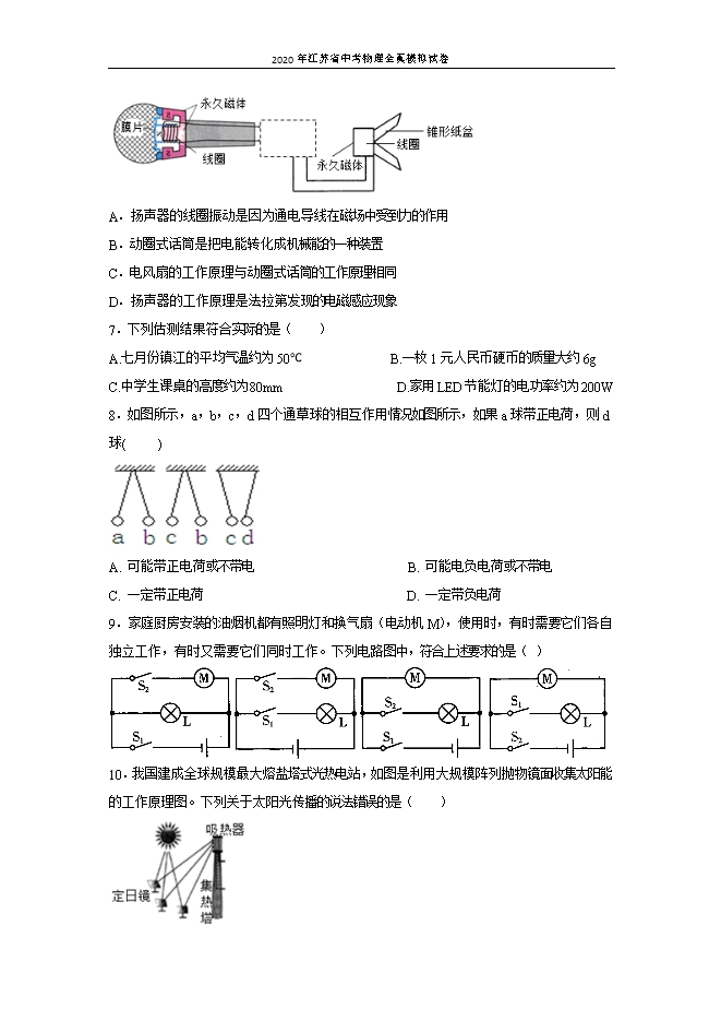 2020年江苏省中考物理全真模拟试卷及解析(镇江卷)