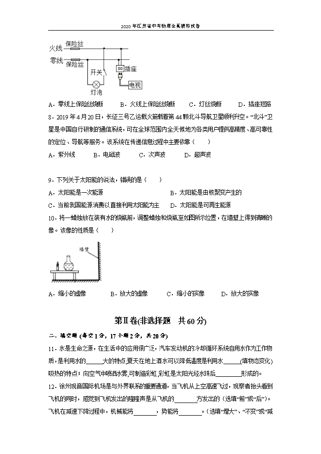 2020年江苏省中考物理全真模拟试卷及解析(徐州卷)