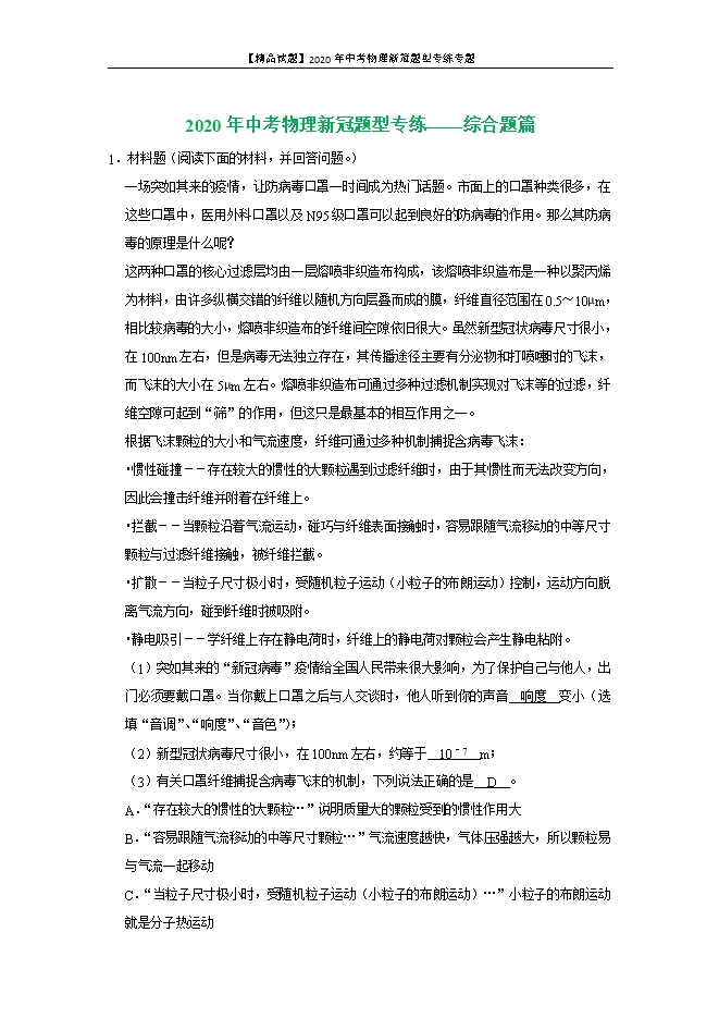 【内容简介】1.材料题(阅读下面的材料,并回答问题。)一场突如其来的疫情,让防病毒口罩一时间成为热门话题。市面上的口罩种类很多,在这些口罩中,医用外科口罩以及N95级口罩可以起到良好的防病毒的作用。那么其防病毒的原理是什么呢?这两种口罩的核心过滤层均由一层熔喷非织造布构成,该熔喷非织造布是一种以聚丙烯为材料,由许多纵横交错的纤维以随机方向层叠而成的膜,纤维直径范围在0.5~10μm,相比较病毒的大小,熔喷非织造布的纤维间空隙依旧很大。虽然新型冠状病毒尺寸很小,在100nm左右,但是病毒无法独立存在,其传播途径主要有分泌物和打喷嚏时的飞沫,而飞沫的大小在5μm左右。熔喷非织造布可通过多种过滤机制实现对飞沫等的过滤,纤维空隙可起到“筛”的作用,但这只是最基本的相互作用之一。根据飞沫颗粒的大小和气流速度,纤维可通过多种机制捕捉含病毒飞沫:•惯性碰撞﹣﹣存在较大的惯性的大颗粒遇到过滤纤维时,由于其惯性而无法改变方向,因此会撞击纤维并附着在纤维上。•拦截﹣﹣当颗粒沿着气流运动,碰巧与纤维表面接触时,容易跟随气流移动的中等尺寸颗粒与过滤纤维接触,被纤维拦截。•扩散﹣﹣当粒子尺寸极小时,受随机粒子运动(小粒子的布朗运动)控制,运动方向脱离气流方向,碰到纤维时被吸附。•静电吸引﹣﹣学纤维上存在静电荷时,纤维上的静电荷对颗粒会产生静电粘附。(1)突如其来的“新冠病毒”疫情给全国人民带来很大影响,为了保护自己与他人,出门必须要戴口罩。当你戴上口罩之后与人交谈时,他人听到你的声音 响度 变小(选填“音调”、“响度”、“音色”);(2)新型冠状病毒尺寸很小,在100nm左右,约等于 10﹣7 m;(3)有关口罩纤维捕捉含病毒飞沫的机制,下列说法正确的是 D 。A.“存在较大的惯性的大颗粒…”说明质量大的颗粒受到的惯性作用大B.“容易跟随气流移动的中等尺寸颗粒…”气流速度越快,气体压强越大,所以颗粒易与气流一起移动C.“当粒子尺寸极小时,受随机粒子运动(小粒子的布朗运动)…”小粒子的布朗运动就是分子热运动D.“当纤维上存在静电荷时,纤维上的静电荷对颗粒会产生静电粘附。”说明带电体有吸引轻小物体的性质【解答】(1)戴上口罩之后与人交谈时,由于口罩的隔音作用,他人听到的说话声音响度减小;(2)因为1nm=10﹣9m,所以100nm=100×1nm=100×10﹣9m=10﹣7m;(3)A、质量大,惯性大,但惯性不是力,所以质量大的颗粒惯性大,不是受到的惯性大,故A不正确;B、气流速度越快,气体压强越小,故B不正确;C、小粒子是尺度较小的固态颗粒,不是分子,所以小粒子的布朗运动不是分子热运动,故C不正确;D、带电体能够吸引轻小物体,所以当纤维上存在静电荷时,纤维上的静电荷对颗粒会产生静电粘附,故D正确。2.短文,回答问题新型冠状病毒漫延世界2020新春之际,突如其来的“新型冠状病毒”在我国武汉暴发,在中国共产党的领导下,全国人民万众一心,科学防治,已经取得了阶段性的胜利。但由于种种原因现已漫延到世界多地,导致我国目前的防控任务仍很艰巨。新型冠状病毒传染性强,对人体危害重,救治难度大。它主要通过人体接触和空气传播,所以,同学们要戴好口罩和手套,做到不聚集、不扎堆、勤洗手,听从防疫人员的指挥和安排,保护好自己就是对国家做贡献。(1)病毒可通过空气传播。当人呼气时胸部收缩,肺的容积减小,肺内含病毒的空气压强 增大 (选填“增大”、“减小”、“不变”),然后就经气管、鼻腔排出体外,还有一部分经痰液排出,痰液在空气中 汽化(蒸发) (选填物态变化名称)病毒又回到空气中。(2)我们在外出时要佩戴口罩来降低病毒的感染率,这一措施类似于下列减弱噪音的哪一种途径? C A.在声源处减弱 B.在传播过程中减弱C.在人耳处减弱 D.两者无相似之处(3)人每打一个喷嚏大约有10万个唾沫飞沫,在1厘秒(0.01s)时间内向前喷射40cm。小一点的喷沫可以在空气中漂浮更长时间,大约能够飞行10m的距离,几分钟工夫就能够扩散到天花板。打喷嚏时唾沫飞沫传播的速度为 40 m/s(4)在急救危重病人时,呼吸功能障碍应急系统(呼吸机)是必不可少的。Puritan﹣Bennett700型急救呼吸机的电源名牌部分数据如下表:电源类型数据指标工作电流交流电源220V 1.3A正常工作时接地泄漏电流<50μA(整机)内置电池24V 7Ah平均工作电流2.8A(呼吸频率15次/min)使用交流电源时该机的额定输入功率是 286 W,若突然停电而使用内置电池,该电池最多能维持患者正常呼吸的工作时间大约为 9000 s。说明:“7Ah”是指电池的最大存储电荷量,已知电荷量与电流和时间的关系是Q=It,电荷量的单位为库仑,符号为C。【解答】(1)当人呼气时胸部收缩,肺的容积减小,肺内含病毒的空气压强增大,然后经气管、鼻腔排出体外;还有一部分经痰液排出,通过痰液的汽化(蒸发)又回到空气中,这样病毒就可通过空气传播。(2)我们在外出时要佩戴口罩来降低病毒的感染率,是在人吸气时降低病毒的感染,类似于在人耳处减弱噪音。(3)打喷嚏时唾沫飞沫在t=0.01s时间内向前喷射的距离s=40cm=0.4m,则打喷嚏时唾沫飞沫传播的速度:v= = =40m/s;(4)由表格数据可知,急救呼吸机使用交流电源时的电压U=220V,电流I=1.3A,则使用交流电源时该机的额定输入功率:P=UI=220V×1.3A=286W;由表格数据可知,内置电池的最大存储电荷量Q=7Ah,急救呼吸机的平均工作电流I′=2.8A,由