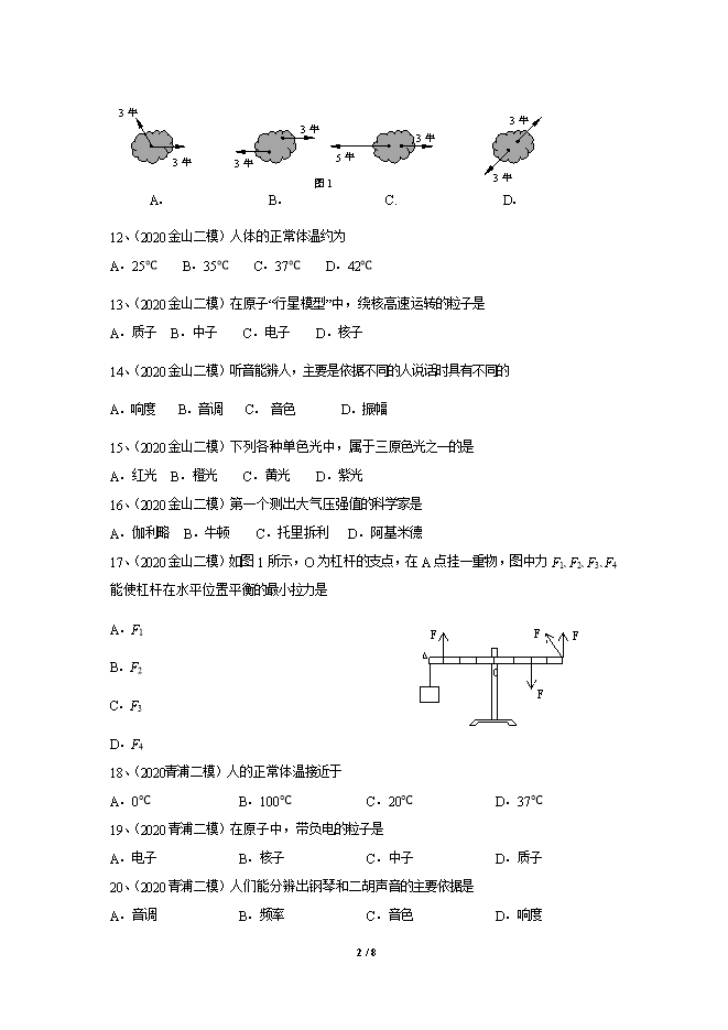 【内容简介】1、(2020闵行二模)在原子中,带负电的粒子是A.电子 B.质子 C.中子 D.原子核2、(2020闵行二模)人们能分辨出钢琴和小提琴声音的主要依据是A.响度 B.音色 C.振幅 D.音调3、(2020闵行二模)首先利用实验测出大气压值的物理学家是 A.伽利略 B.阿基米德 C.卢瑟福 D.托里拆利4、(2020闵行二模)热机工作时将蒸汽或燃气的内能转化为A.化学能 B.电能 C.机械能 D.核能5、(2020闵行二模)如图所示,用5牛的拉力F匀速竖直提升重为G的物体,使其上升了0.2米。若不计滑轮自重及摩擦,关于物体的重力G和绳子自由端移动的距离s,下列判断中正确的是A.G=2.5牛,s=0.1米B.G=2.5牛,s=0.4米C.G=10牛,s=0.4米D.G=10牛,s=0.1米6、(2020宝山二模)原子中带负电的微粒是A.电子 B.质子 C.中子 D.原子核7、(2020宝山二模)最先用实验测取大气压值的科学家是A.德谟克里特 B.伽利略 C.托里拆利 D.阿基米德8、(2020宝山二模)下列单色光中,属于三原色光的是A.黄光 B.绿光 C.橙光 D.紫光9、(2020宝山二模)小孩从滑梯上端沿斜面匀速滑到底部,不变的是A.内能 B.重力势能 C.动能 D.机械能。10、(2020宝山二模)下列光学器具在使用中,成倒立实像的是A.幻灯机镜头 B.放大镜 C.穿衣镜 D.近视眼镜11、(2020宝山二模)如图1所示,物体受到两个力的作用,这两个力能平衡的是 12、(2020金山二模)人体的正常体温约为A.25℃ B.35℃ C.37℃ D.42℃13、(2020金山二模)在原子“行星模型”中,绕核高速运转的粒子是A.质子 B.中子 C.电子 D.核子14、(2020金山二模)听音能辨人,主要是依据不同的人说话时具有不同的A.响度 B.音调 C. 音色 D.振幅15、(2020金山二模)下列各种单色光中,属于三原色光之一的是 A.红光 B.橙光 C.黄光 D.紫光16、(2020金山二模)第一个测出大气压强值的科学家是 A.伽利略 B.牛顿 C.托里拆利 D.阿基米德17、(2020金山二模)如图1所示,O为杠杆的支点,在A点挂一重物,图中力F1、F2、F3、F4能使杠杆在水平位置平衡的最小拉力是