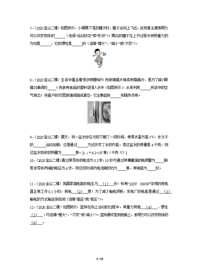 【内容简介】1、(2020闵行二模)杂技表演时演员将小球向上抛出,上升过程中,小球的重力势能 (1) ,惯性 (2) (均选填“变大”、“不变”或“变小”);在重力的作用下,小球的速度越来越小,这说明力可以改变物体的 (3) 。2、(2020闵行二模)某电水壶如图所示,其壶嘴和壶身构成一个 (4) (填装置名称)。当壶内装入水后,水深0.15米,壶底受到水的压强为 (5) 帕。壶内热水静置一段时间后,水温就会降下来,这是通过 (6) 的方式,改变了壶内水的内能。 3、(2020闵行二模)我国家庭电路的电压为 (7) 伏,家用电器消耗的电能可用 (8) 表进行测量。发电站通过高压输电线路将电能输送至用电区,远距离输电采用高压的目的是 (9) 。4、(2020闵行二模)某导体电阻为20欧,10秒内通过该导体横截面的电荷量为3库,通过该导体的电流为 (10) 安,该导体两端的电压为 (11) 伏。若将该导体两端电压增大为原来的两倍,此时该导体的电阻为 (12) 欧。5、(2020闵行二模)将物块用细线悬挂于测力计下方,如图(a)所示,静止时测力计示数为F1;若将它浸没于水中并保持静止,如图(b)所示,此时测力计的示数为F2,则物块所受浮力大小为 (13) 、方向 (14) 。若将物块一半浸入水中时,物块受到重力与浮力的合力大小为 (15) 。 6、(2020宝山二模)一节新干电池的电压为______伏,将两节相同的干电池_____联在一起可以使电源电压增大;给手机充电,是将电能转化为______能而储存起来。7、(2020宝山二模)如图所示,小娟踢下落的毽子时,毽子会向上飞出,此现象主要表明力可以改变物体的______(选择“运动状态”或“形状”);踢出的毽子在上升过程中所受重力的方向是______,它的惯性是______的(选填“增大”、“减小”或“不变”)。 8、(2020宝山二模)生活中蕴含着很多物理知识:将玻璃镜片换成树脂镜片,是为了减小眼镜对鼻梁的_____;将装有食品的塑料袋浸入水中(如图所示),从而利用______将袋中的空气排出;将窗户的双层玻璃间抽成真空,它主要起到______和隔热作用。 9、(2020宝山二模)夏天,将一盆水放在太阳下晒了一段时间,使得水温升高5℃,水分子的_______运动加剧,这是通过______方式改变了水的内能,若这盆水的质量是4千克,则这盆水吸收的热量为________焦。[c水=4.2×103焦/(千克•℃)]10、(2020宝山二模)通过某导体的电流为0.3安,10秒内通过其横截面的电荷量为_____库;若该导体两端的电压为6伏,则这段时间内电流做的功为_____焦,其电阻为_____欧。11、(2020金山二模)我国家庭电路的电压为 (1) 伏;标有“220V 800W”字样的用电器正常工作0.5小时,耗电 (2) 度;为了减少输电损耗,发电厂的电能是通过 (3) 输电的方式输送到各地(选填“高压”或“低压”)。12、(2020金山二模)如图所示,篮球在向上运动的过程中,其重力势能 (4) 、惯性 (5) (均选填“增大”、“不变”或“减小”)。篮球最终落到地面上,表明力可以改变物体的 (6) 。