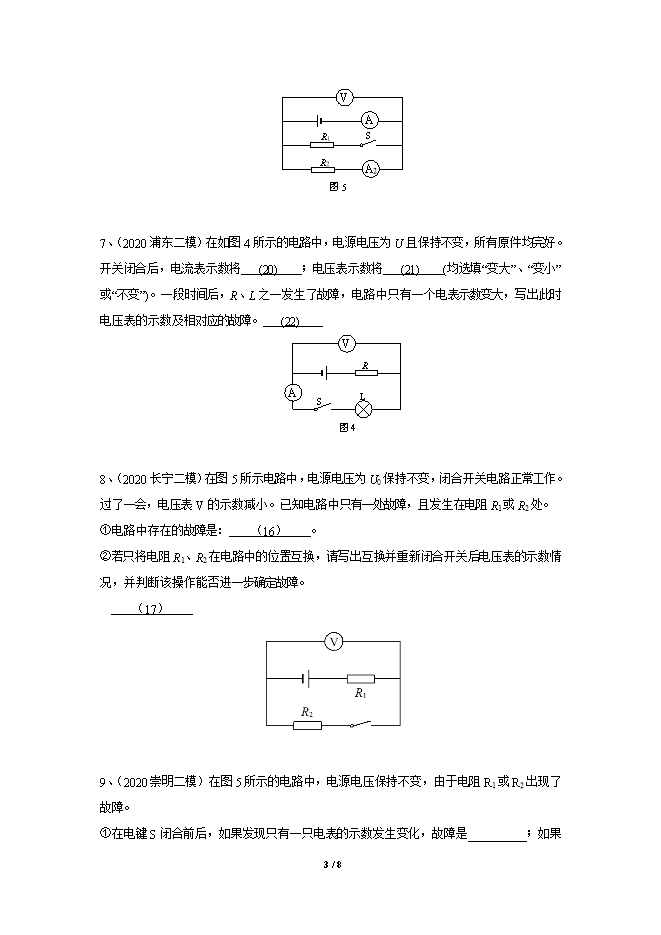 【内容简介】1、(2020闵行二模)如图7所示的电路中,电源电压保持U不变,闭合开关S,电路正常工作。一段时间后,由于其中一个电阻出现故障,使得电压表示数变大。 (1)电路中可能存在的故障是   (16)    。(2)如果用完好的小灯替换R1,请指出不同故障情况下,小灯替换前后电压表示数的变化情况。   (17)    2、(2020宝山二模)在图6所示的电路中,电源电压保持不变,电键S闭合后,小灯L发光,移动划片P后,发现小灯熄灭。若电路中仅有AB两点间或BC两点间出现故障,请利用一个完好的电流表(或电压表)连入该电路中,根据相关信息写出电表连接情况和示数情况,判断出相对应的故障。 ______________________________________________________________________________________________________________________________________________________3、(2020金山二模)在图5所示的电路中,已知电源电压为U且保持不变。若电路中电阻R1或R2发生了短路故障。 ① 当电键S断开时,电流表A的示数为  (16)  ,电压表V的示数为  (17)  ;② 当电键S闭合后,两个电表的示数均发生了变化。请根据相关信息写出电表示数变化情况及对应的故障。  (18)  。4、(2020青浦二模)在图5所示的电路中,电源电压为U。已知电路中仅有一处故障,且只发生在电阻R、灯L上。电键S闭合前后,电流表指针所在的位置不变。请根据相关信息判断电流表有无示数及对应的故障。________(19) 5、(2020松江二模)在图4所示的电路中,电阻R1、R2的阻值相等,开关S闭合后,电路正常工作,电流表和电压表的示数分别为I0和U0。一段时间后,观察到其中一个电表示数突然变大,已知电路中仅有一处故障,且只发生在电阻R1、R2上,请根据以上信息写出两电表示数及相对应的故障。                          (16)                              6、(2020静安二模)在图5所示的电路中,电源电压为U,电阻R1、R2的阻值均为R。开关S由断开到闭合,电压表V示数与电流表A或A2示数的比值均未发生变化,若电路的故障只发生在电阻R1、R2中的一处,则电路中各电表的示数及故障为:________(16)。