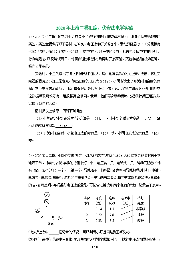 【内容简介】1、(2020闵行二模)某学习小组成员小兰进行测定小灯电功率实验,小明进行伏安法测电阻实验。实验室提供了以下器材:电流表、电压表和开关各2个、滑动变阻器3个(分别标有“5欧 2安”、“10欧 1安”、“20欧 1安”字样)、新干电池5节、标有“3.5伏”字样的小灯、待测电阻Rx以及导线若干。他俩合理分配器材后同时开展实验,实验中电路连接均正确、操作步骤规范。实验时,小兰先读出了开关刚闭合时的数据,其中电流表示数为0.2安;接着,移动变阻器的滑片至小灯正常发光,读出此时的电流为0.24安。小明也读出了开关刚闭合时的数据,其中电压表示数为2.1伏;接着移动滑片至中点位置,读出了第二组数据。他们相互交流数据后发现恰好有一组数据完全相同。最后,他们再次移动滑片,分别测出第三组数据,完成了各自的实验。请根据以上信息,回答下列问题。(1)小兰确定小灯正常发光的方法是 (12) ,该小灯的额定功率是 (13) 瓦;小明的实验原理是 (14) 。(2)开关刚闭合时,小兰电压表的示数是 (15) 伏,小明电流表的示数是 (16) 安。2、(2020宝山二模)小顾同学做“测定小灯泡的额定电功率”实验,实验室提供的器材有干电池若干节、标有“3.8伏”字样的待测小灯一个、电压表一只、电流表一只,滑动变阻器(标有“20Ω 2A”字样)一个,电键一个,导线若干。他按图16先将用导线将待测小灯、电键、电流表、电压表连接好,然后将干电池先后一节、两节串联后和三节串联后逐次接入电路中的A、B两点间,并调整好电压表的量程,再闭合电键读取两个电表的示数,记录在下表中。 ⑴分析上表中______栏记录的情况,可以判断小灯是否达到正常发光。⑵分析上表中记录的电压变化,发现随着电池节数的增加,小灯两端的电压增加量逐渐减小,造成这一现象的原因可能是_________________________。⑶为了利用实验室提供的这些器材使小灯正常发光,小顾同学接下来的操作是:___________________________________________________________。⑷小顾同学按合理的设计方案正确连接电路,且操作步骤正确,当小灯正常发光时电流表的示数如图17所示,则小灯的额定电流为______安,小灯的额定功率为______瓦。 3、(2020金山二模)现有器材:电源两个(电压分别4.5伏和6伏),电压表、电流表和电键各两个,滑动变阻器A、B两个(A标有“10Ω 1Α” 、B标有“20Ω 2Α”字样),待测小灯泡(标有“2.5V”字样)和待测电阻RX各一个,及导线若干。小华做“用电流表、电压表测电阻” 实验,小红同时要做“测定小灯泡的电功率”实验,两位同学分配器材,然后使用各自分得的器材正确连接电路后进行实验。 ① 在小华的实验中,实验步骤正确,当刚闭合电键时发现两电表的示数如图14(a)、(b)所示,(a)此时测得的电阻Rx= (13) 欧。(精确到0.1欧)(b)小华继续实验获取多组数据,是为了 (14) 。② 在小红的实验中,当滑片在变阻器的中点附近(阻值为最大阻值的一半)时,小灯正常发光。(a)小红在实验中,选择的滑动变阻器是 (15) (选填“A”或“B”)。(b)计算出小灯泡的额定功率P额。(需写出计算过程) (16) 4、(2020青浦二模)小华同学做“测定小灯泡的电功率”实验,现有电源(电压不变)、待测小灯(标有“0.28A”字样)、电流表、电压表(只有0~3伏完好)、滑动变阻器、开关以及导线若干。他正确连接电路进行实验,在移动变阻器滑片至某一位置时,发现电压表、电流表的示数如图12(a)、(b)所示,小灯发光偏暗。他经过思考后,在不改变滑片P位置的情况下重新连接电路,闭合开关,电压表示数如图12(c)所示,然后移动变阻器滑片使小灯正常发光,发现电压表的指针由12(c)位置偏转了8小格。