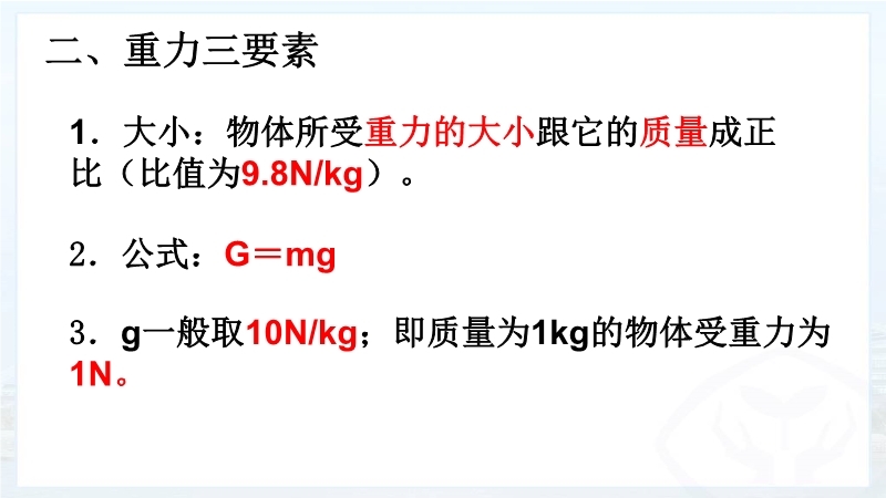 【内容简介】一、重力1.定义:地面及其附近的物体由于地球的吸引而受到的力。2.符号:G 单位:N3.重力的施力物体是地球;地球上所有物体都受到重力作用。4.画出重力跟质量关系的图像二、重力三要素1.大小:物体所受重力的大小跟它的质量成正比(比值为9.8N/kg)。2.公式:G=mg3.g一般取10N/kg;即质量为1kg的物体受重力为1N。