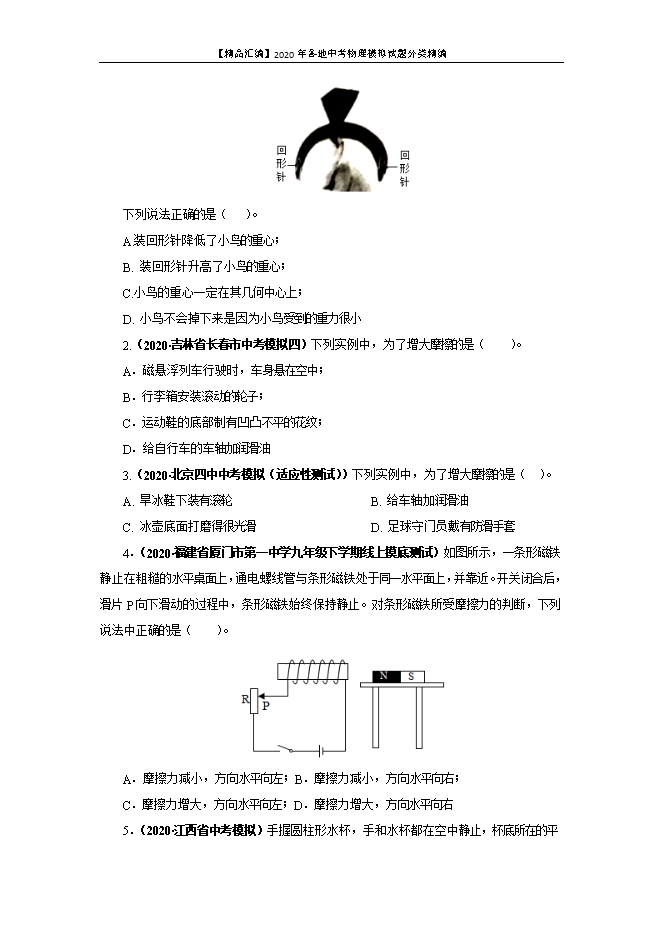 【内容简介】1.(2020•山东省济宁中考模拟三)如图所示,纸做的“不倒翁”小鸟翅膀上装有两个回形针,将鸟嘴放在指尖上转动而不会掉下来。 下列说法正确的是( )。A.装回形针降低了小鸟的重心;B. 装回形针升高了小鸟的重心;C.小鸟的重心一定在其几何中心上;D. 小鸟不会掉下来是因为小鸟受到的重力很小【答案】A。【解析】物体的重心跟物体的形状和质量分布有关。形状规则质量均匀的物体,其重心在几何中心;小鸟的形状不规则,重心不在几何中心上;鸟嘴上没有胶水,由于装上回形针后,小鸟的重心降低了,稳定性增强,故只有A正确。故答案是A。2.(2020•吉林省长春市中考模拟四)下列实例中,为了增大摩擦的是( )。A.磁悬浮列车行驶时,车身悬在空中;B.行李箱安装滚动的轮子;C.运动鞋的底部制有凹凸不平的花纹;D.给自行车的车轴加润滑油【答案】C。【解析】A、磁悬浮列车行驶时,车身悬在空中,是通过使接触面脱离来减小摩擦力的。故A错误;B、行李箱安装滚动的轮子,是用滚动代替滑动来减小摩擦力的。故B错误;C、运动鞋的底部制有凹凸不平的花纹,是在压力一定时,通过增大接触面的粗糙程度来增大摩擦力。故C正确;D、给自行车的车轴加润滑油,是通过使接触面脱离来减小摩擦力的。故D错误。故选C。3.(2020•北京四中中考模拟(适应性测试))下列实例中,为了增大摩擦的是( )。A. 旱冰鞋下装有滚轮B. 给车轴加润滑油C. 冰壶底面打磨得很光滑D. 足球守门员戴有防滑手套【答案】D。【解析】A.旱冰鞋上装了轮子,是用滚动代替滑动来减小摩擦,故A不符合题意;B.给车轴加润滑油,是通过减小接触面的粗糙程度来减小摩擦力,故B不符合题意;C.冰壶底面打磨得很光滑,这是通过减小接触面的粗糙程度来减小摩擦,故C不符合题意;D.足球守门员戴有防滑手套,是通过增大接触面的粗糙程度来增大摩擦力,故D正确。故选D。4.(2020•福建省厦门市第一中学九年级下学期线上摸底测试)如图所示,一条形磁铁静止在粗糙的水平桌面上,通电螺线管与条形磁铁处于同一水平面上,并靠近。开关闭合后,滑片P向下滑动的过程中,条形磁铁始终保持静止。对条形磁铁所受摩擦力的判断,下列说法中正确的是( )。 A.摩擦力减小,方向水平向左;B.摩擦力减小,方向水平向右;C.摩擦力增大,方向水平向左;D.摩擦力增大,方向水平向右【答案】D。【解析】由安培定则得,电磁铁左端为N极,右端为S极,则与条形磁铁的异名极相对,相互吸引,则条形磁铁受到电磁铁向左的吸引力,因条形磁铁始终保持静止,所以它受到的吸引力和桌面给它的摩擦力是一对平衡力,大小相等,方向相反,所以条形磁铁受到的摩擦力的方向是向右的;当滑片逐渐向下移动时,连入电路的电阻逐渐减小,由欧姆定律可得线圈中电流逐渐变大,则磁场逐渐变强,条形磁铁受到电磁铁的吸引力逐渐变大,因条形磁铁受的是平衡力,故摩擦力的大小也会逐渐增大。故选D。5.(2020•江西省中考模拟)手握圆柱形水杯,手和水杯都在空中静止,杯底所在的平面是水平面,如图所示。下列各对力属于平衡力的是( )。 A.手对水杯的压力和水杯对手的压力;B.水杯的重力与手对水杯的压力;C.水杯的重力与手对水杯的静摩擦力;D.水杯对手的静摩擦力与手对水杯的静摩擦力【答案】C。【解析】A. 手对水杯的压力与水杯对手的压力是一对作用力与反作用力,这两个力等大、反向、共线,但不共物,所以不是一对平衡力;故A错误。B. 手对水杯的压力是沿水平方向的, 水杯的重力方向是竖直向下的,两者不反向,所以不是一对平衡力;故B错误。C. 水杯在竖直方向上处于静止状态,即平衡状态,所以受到平衡力的作用;在竖直方向上水杯只受到:重力和手对水杯的摩擦力两个力的作用,故这两个力是一对平衡力;故C正确。D. 水杯对手的摩擦力和手对水杯的摩擦力是一对作用力与反作用力,这两个力等大、反向、共线,但不共物,所以不是一对平衡力;故D错误。故选C。6.(2020•北京市朝阳区中考模拟(延期开学网上考试)如图的事例中,目的是为了减小摩擦的是( )。A. 在瓶盖上制出细条纹;B. 在乒乓球拍上粘一层胶粒;C. 在守门员的手套上粘橡胶;D. 为车轴添加润滑油【答案】D。【解析】A.在瓶盖上制出细条纹,这是在压力不变的情况下,通过增大接触面的粗糙程度来增大摩擦的,不符合题意; B.在乒乓球拍上粘一层胶粒,这是在压力不变的情况下,通过增大接触面的粗糙程度来增大摩擦的,不符合题意; C.在守门员的手套上粘橡胶,这是在压力不变的情况下,通过增大接触面的粗糙程度来增大摩擦的,不符合题意;D.为车轴添加润滑油,是通过使接触面脱离来减小摩擦力。符合题意;故选D。