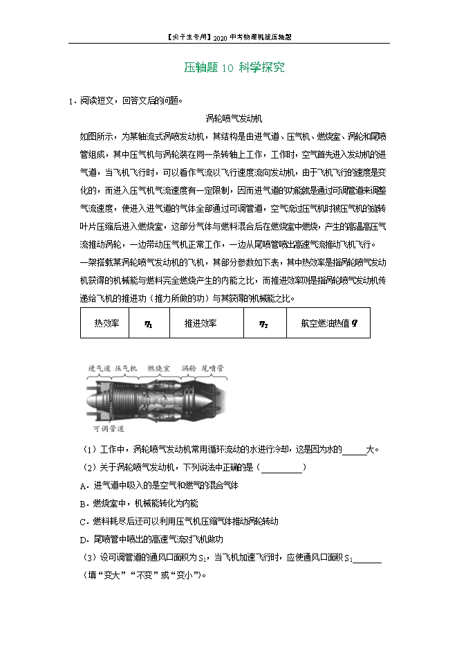 【内容简介】1.阅读短文,回答文后的问题。涡轮喷气发动机如图所示,为某轴流式涡喷发动机,其结构是由进气道、压气机、燃烧室、涡轮和尾喷管组成,其中压气机与涡轮装在同一条转轴上工作,工作时,空气首先进入发动机的进气道,当飞机飞行时,可以看作气流以飞行速度流向发动机,由于飞机飞行的速度是变化的,而进入压气机气流速度有一定限制,因而进气道的功能就是通过可调管道来调整气流速度,使进入进气道的气体全部通过可调管道,空气流过压气机时被压气机的旋转叶片压缩后进入燃烧室,这部分气体与燃料混合后在燃烧室中燃烧,产生的高温高压气流推动涡轮,一边带动压气机正常工作,一边从尾喷管喷出高速气流推动飞机飞行。一架搭载某涡轮喷气发动机的飞机,其部分参数如下表,其中热效率是指涡轮喷气发动机获得的机械能与燃料完全燃烧产生的内能之比,而推进效率则是指涡轮喷气发动机传递给飞机的推进功(推力所做的功)与其获得的机械能之比。热效率 推进效率 航空燃油热值 (1)工作中,涡轮喷气发动机常用循环流动的水进行冷却,这是因为水的______大。(2)关于涡轮喷气发动机,下列说法中正确的是(__________)A.进气道中吸入的是空气和燃气的混合气体B.燃烧室中,机械能转化为内能C.燃料耗尽后还可以利用压气机压缩气体推动涡轮转动D.尾喷管中喷出的高速气流对飞机做功(3)设可调管道的通风口面积为S1,当飞机加速飞行时,应使通风口面积S1_______(填“变大”“不变”或“变小”)。(4)已知上述飞机所受空气阻力f与飞行速度v的平方成正比,比例系数为k,当飞机以 的水平速度匀速巡航t秒,若涡轮喷气发动机的功效Q是指发动机提供给飞机的推力与发动机机械功率的比值,则其功效的字母表达式为Q=______N/W(用提供的字母表达)。【答案】比热容;D;变大; 【解析】【详解】(1)[1]发动机用循环水进行冷却是因为水的比热容较大;(2)[2]A.由文中信息可知,进气道吸入的是空气,故A错误;B.燃料燃烧是化学能转化为内能,故B错误;C.燃料耗尽后,不会产生高温高压气流,无法推动涡轮,故C错误;D.尾喷管中喷出的高速气流推进飞机前进,对飞机做功,故D正确。故选D;(3)[3]由于进人压气机气流速度有一定限制,而进气道的功能就是通过可调管道来调整气流速度,使进入进气道的气体全部通过可调管道,当飞机加速飞行时,需要更多的空气流进燃烧室,即应该使通风口面积S1变大;(4)[4]飞机所受空气阻力f与飞行速度v的平方成正比,比例系数为k,所以推力: ;飞机获得的推进功: ;而推进效率则是指涡轮喷气发动机传递给飞机的推进功(推力所做的功)与其获得的机械能之比,所以获得的机械能: ;机械能的功率: ;发动机的功效是指发动机提供给飞机的推力与发动机机械功率的比值,所以其功效为: 。【点睛】本题的第(4)问中考新名词功效的推导计算,在答此问时首先要结合题文信息理解功效的含义,先依据飞行速度表示出匀速飞行时所受的阻力(即推力),再依据功的公式表示出单位时间内所做的功,接着利用推进效率表示出机械能大小,算出机械功率,最后利用功效等于推力与机械功率的比值求出功效,该过程需要对各个物理量所需要公式的熟练掌握。2.为救治病人,急需将一种药品送到偏远的山村,这种药品要求在0℃以下存放,常用保温瓶不能满足需要。同学们经过讨论,为保障药品在0℃以下存放,设计了如图所示的冷藏盒。