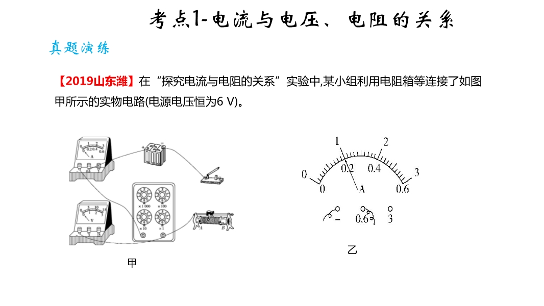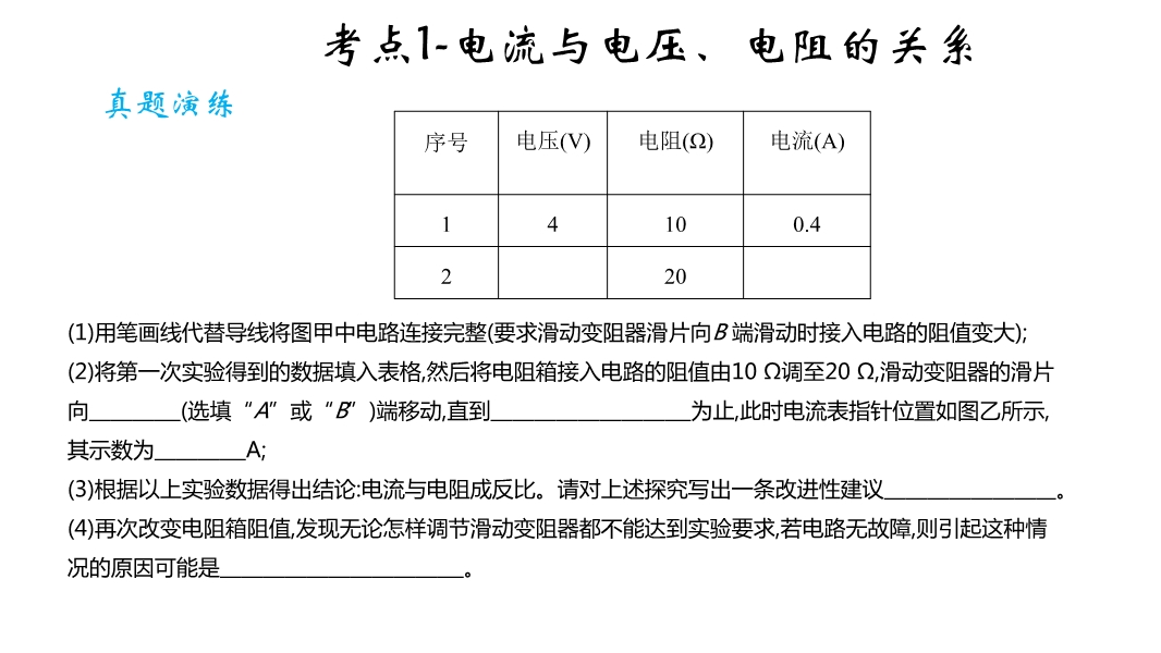 【内容简介】考点1-电流与电压、电阻的关系【2019山西】在“探究电流与电阻的关系”实验中:(1)如图甲所示,请你用笔画线代替导线,将图中电路连接完整(请勿更改原有导线,导线不得交叉),要求:当滑动变阻器的滑片P向左移动时,电路中的电流变大。连接电路时,开关必须 。(2)闭合开关后,发现电压表有示数且接近电源电压,电流表无示数,其原因可能是 (3)实验过程中,将5 Ω的电阻接入电路中,闭合开关,调节滑动变阻器滑片P至适当位置,此时电流表示数如图乙所示,则电流表示数为 A。将5 Ω的电阻更换为10 Ω的电阻,闭合开关,应将滑动变阻器的滑片P 向 (选填“左”或“右”)端移动,使电压表示数为 V。【答案】(1)如图所示 断开 (2)电阻R 处断路 (3)0.3 右 1.5【解析】(1)滑片向左移动,电路中电流变大,则滑动变阻器接入电路的电阻变小,所以滑动变阻器左下接线柱应接入电路;连接电路时开关应断开,可以保护电路。(2)电压表示数接近电源电压,电流表无示数,说明电压表所并联的部分电路断路,故原因可能是电阻R处断路。(3)由甲图可知,电流表选用0~0.6 A量程,故乙图电流表示数为0.3 A,将5 Ω电阻更换为10 Ω电阻时,要保证电压表示数与原来相同,根据串联分压关系可知,滑动变阻器接入电路的阻值应变大,故滑片P应向右移动,使电压表示数U=IR=0.3 A×5 Ω=1.5 V。