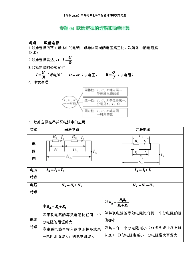【备战2020】中考物理电学三轮复习精准突破专题:04 欧姆定律的理解和简单计算