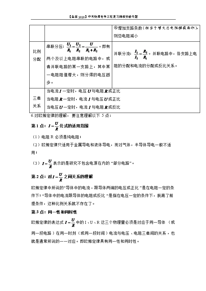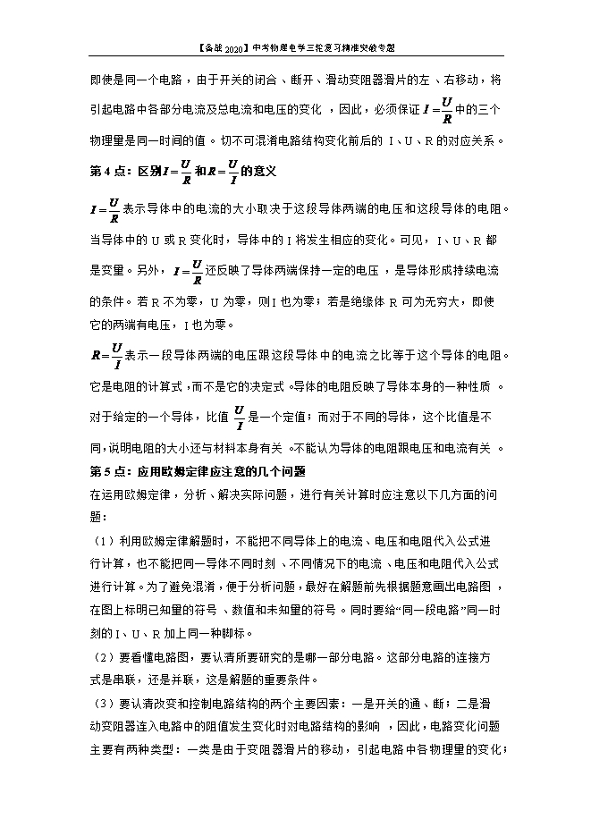 【内容简介】考点一 欧姆定律1.欧姆定律内容:导体中的电流,跟导体两端的电压成正比,跟导体中的电阻成反比。2.欧姆定律表达式: 3.欧姆定律的公式变形: (求电流) (求电压) (求电阻) 4. 注意事项 5. 欧姆定律在串并联电路中的应用类型串联电路并联电路电路图 电流特点 电压特点 电阻特点① ②串联电路的等效电阻比任何一个分电阻的阻值都大③串联电路中接入的电阻越多或某一电阻阻值增大,则总电阻增大① ②并联电路的等效电阻比任何一个分电阻的阻值都小③其中任一个分电阻减小(相当于减小总电阻长度),则总电阻也减小,分电阻增大而增大④增加支路条数(相当于增大总电阻横截面积),则总电阻减小比例分配串联分压: 。即有两个及以上电阻串联的电路中,或者并联电路的某一支路上,其中某一电阻阻值增大,则分得的电压越多。并联分流: 。并联电路中,各支路上电阻的分配和电流的分配成反比关系。三者关系当电流 一定时,电压 与电阻 成正比当电阻 一定时,电流 与电压 成正比当电压 一定时,电流 与电阻 成反比6.对欧姆定律的理解,要注意理解以下5点:第1点: 公式的适用范围(1)电阻R必须是纯电阻;(2)欧姆定律只适用于金属导电和液体导电,而对气体,半导体导电一般不适用;(3) 表示的是研究不包含电源在内的“部分电路”。第2点:对 之间关系的理解欧姆定律中所说的“导体中的电流,跟导体两端的电压成正比”是在电阻一定的条件下;“导体中的电流跟导体的电阻成反比”是指在电压一定的条件下,脱离了前提条件,这种比例关系就不存在了。 第3点:同一性和同时性欧姆定律的表达式 中的I、U、R这三个物理量必须是对应于同一导体(或同一段电路)在同一时刻(或同一段时间)电流与电压、电阻三者间的关系,也就是通常所说的一一对应。即欧姆定律具有同一性和同时性。即使是同一个电路,由于开关的闭合、断开、滑动变阻器滑片的左、右移动,将引起电路中各部分电流及总电流和电压的变化,因此,必须保证 中的三个物理量是同一时间的值。切不可混淆电路结构变化前后的I、U、R的对应关系。第4点:区别 和 的意义 表示导体中的电流的大小取决于这段导体两端的电压和这段导体的电阻。当导体中的U或R变化时,导体中的I将发生相应的变化。可见,I、U、R都是变量。另外, 还反映了导体两端保持一定的电压,是导体形成持续电流的条件。若R不为零,U为零,则I也为零;若是绝缘体R可为无穷大,即使它的两端有电压,I也为零。 表示一段导体两端的电压跟这段导体中的电流之比等于这个导体的电阻。它是电阻的计算式,而不是它的决定式。导体的电阻反映了导体本身的一种性质。对于给定的一个导体,比值 是一个定值;而对于不同的导体,这个比值是不同,说明电阻的大小还与材料本身有关。不能认为导体的电阻跟电压和电流有关。第5点:应用欧姆定律应注意的几个问题在运用欧姆定律,分析、解决实际问题,进行有关计算时应注意以下几方面的问题:(1)利用欧姆定律解题时,不能把不同导体上的电流、电压和电阻代入公式进行计算,也不能把同一导体不同时刻、不同情况下的电流、电压和电阻代入公式进行计算。为了避免混淆,便于分析问题,最好在解题前先根据题意画出电路图,在图上标明已知量的符号、数值和未知量的符号。同时要给“同一段电路”同一时刻的I、U、R加上同一种脚标。(2)要看懂电路图,要认清所要研究的是哪一部分电路。这部分电路的连接方式是串联,还是并联,这是解题的重要条件。(3)要认清改变和控制电路结构的两个主要因素:一是开关的通、断;二是滑动变阻器连入电路中的阻值发生变化时对电路结构的影响,因此,电路变化问题主要有两种类型:一类是由于变阻器滑片的移动,引起电路中各物理量的变化;另一类是由于开关的断开或闭合,引起电路中各物理量的变化。解答电路变化问题的思路为:先看电阻变化,再根据欧姆定律和串、并联电路的特点来分析电压和电流的变化。这是电路分析的基础(4)掌握“具体问题做具体分析”这一原则,不能乱套公式,并注意单位的统一。解答简单电路问题时,首先要根据题目的已知条件。分析出用电器是串联还是并联。接着画出电路图或等效电路图,在图上标明已知量和未知量的符号,并在代表各物理量的字母下注明相应的脚码(如果题中电路图已画出,不必再画)。然后根据欧姆定律及串、并联电路的特点逐一列式,有时还需运用数学知识,列方程组,根据所列的式子或方程组求出结果。考点二 串、并联电路中电阻的关系