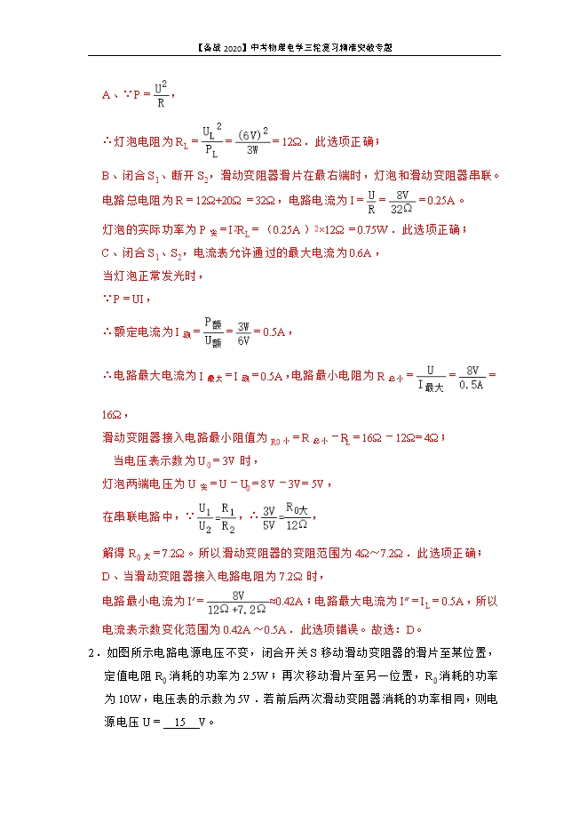 【内容简介】计算题解题思路关键是分别抓住电路变化前后所处状态,分析电路中的变化量和不变量,运用有关电学规律和电路特点建立状态方程,联立求解。总之,只要掌握正确的解题思路和方法,常见电路的计算问题都能迎刃而解。解题思路如下结构图: 命题点一滑动变阻器滑片引起的相关计算 1.如图,电源电压为8V,小灯泡L上标有“6V 3W”字样,已知滑动变阻器R的最大阻值为20Ω,电流表的量程为0﹣0.6A,电压表的量程为0﹣3V.灯泡电阻不随温度变化,下列说法不正确的是( ) A.灯泡的电阻为12ΩB.闭合S1、断开S2,滑动变阻器滑片在最右端时,灯泡的实际功率为0.75WC.闭合S1、S2,要保证电路中各元件安全,滑动变阻器R的取值范围4Ω﹣7.2ΩD.闭合S1、S2,移动滑动变阻器,电流表的示数变化范围0.25﹣0.6 A【分析】①已知灯泡额定电压和额定功率,利用公式R= 得到灯泡电阻;②闭合S1、断开S2,滑动变阻器滑片在最右端时,灯泡和整个滑动变阻器串联;已知电源电压、灯泡和滑动变阻器接入电路的电阻,可以得到电路电流;已知灯泡电阻和电路电流,利用公式P=I2R得到灯泡实际功率;③闭合S1、S2,灯泡和滑动变阻器串联。已知灯泡额定电压和额定功率,可以得到正常工作的电流;已知灯泡正常工作的电流和电流表的最大测量值,可以得到电路最大电流;已知电源电压和电路最大电流,可以得到电路最小电阻;已知电路最小电阻和灯泡电阻,两者之差就是滑动变阻器接入电路的电阻;已知电压表最大测量值,可以得到滑动变阻器两端电压;已知电源电压和滑动变阻器两端电压,可以得到灯泡两端电压;根据串联电路用电器两端电压与其阻值成正比得到滑动变阻器接入电路的最大阻值;④为保护灯泡,电路最大电流为灯泡正常发光电流;已知滑动变阻器接入电路最大阻值,可以得到电路总电阻;已知电源电压和电路总电阻,可以得到电路最小电流。【解答】解:A、∵P= ,∴灯泡电阻为RL= = =12Ω.此选项正确;B、闭合S1、断开S2,滑动变阻器滑片在最右端时,灯泡和滑动变阻器串联。电路总电阻为R=12Ω+20Ω=32Ω,电路电流为I= = =0.25A。灯泡的实际功率为P实=I2RL=(0.25A)2×12Ω=0.75W.此选项正确;C、闭合S1、S2,电流表允许通过的最大电流为0.6A,当灯泡正常发光时,∵P=UI,∴额定电流为I额= = =0.5A,∴电路最大电流为I最大=I额=0.5A,电路最小电阻为R总小= = =16Ω,滑动变阻器接入电路最小阻值为R0小=R总小﹣RL=16Ω﹣12Ω=4Ω;当电压表示数为U0=3V时,灯泡两端电压为U实=U﹣U0=8V﹣3V=5V,在串联电路中,∵ ,∴ ,解得R0大=7.2Ω。所以滑动变阻器的变阻范围为4Ω~7.2Ω.此选项正确;D、当滑动变阻器接入电路电阻为7.2Ω时,电路最小电流为I′= ≈0.42A;电路最大电流为I″=IL=0.5A,所以电流表示数变化范围为0.42A~0.5A.此选项错误。故选:D。2.如图所示电路电源电压不变,闭合开关S移动滑动变阻器的滑片至某位置,定值电阻R0消耗的功率为2.5W;再次移动滑片至另一位置,R0消耗的功率为10W,电压表的示数为5V.若前后两次滑动变阻器消耗的功率相同,则电源电压U= 15 V。
