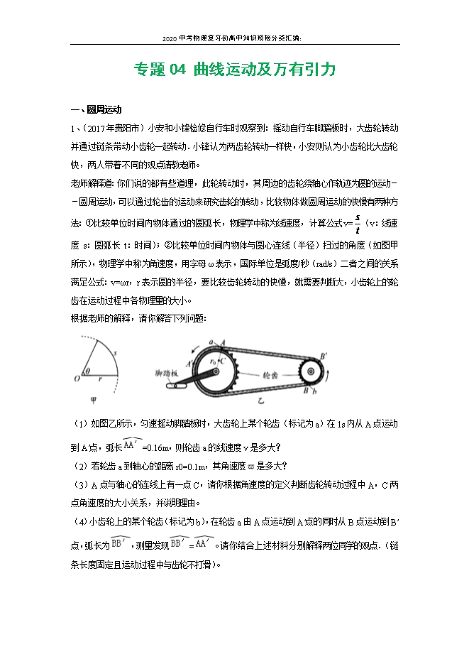 【内容简介】一、圆周运动1、(2017年贵阳市)小安和小锋检修自行车时观察到:摇动自行车脚踏板时,大齿轮转动并通过链条带动小齿轮一起转动.小锋认为两齿轮转动一样快,小安则认为小齿轮比大齿轮快,两人带着不同的观点请教老师。老师解释道:你们说的都有些道理,此轮转动时,其周边的齿轮绕轴心作轨迹为圆的运动﹣﹣圆周运动,可以通过轮齿的运动来研究齿轮的转动,比较物体做圆周运动的快慢有两种方法:①比较单位时间内物体通过的圆弧长,物理学中称为线速度,计算公式v= (v:线速度 s:圆弧长 t:时间);②比较单位时间内物体与圆心连线(半径)扫过的角度(如图甲所示),物理学中称为角速度,用字母ω表示,国际单位是弧度/秒(rad/s)二者之间的关系满足公式:v=ωr,r表示圆的半径,要比较齿轮转动的快慢,就需要判断大,小齿轮上的轮齿在运动过程中各物理量的大小。根据老师的解释,请你解答下列问题: (1)如图乙所示,匀速摇动脚踏板时,大齿轮上某个轮齿(标记为a)在1s内从A点运动到A′点,弧长 =0.16m,则轮齿a的线速度v是多大?(2)若轮齿a到轴心的距离r0=0.1m,其角速度ϖ是多大?(3)A点与轴心的连线上有一点C,请你根据角速度的定义判断齿轮转动过程中A,C两点角速度的大小关系,并说明理由。(4)小齿轮上的某个轮齿(标记为b),在轮齿a由A点运动到A′点的同时从B点运动到B′点,弧长为 ,测量发现 = 。请你结合上述材料分别解释两位同学的观点.(链条长度固定且运动过程中与齿轮不打滑)。解析:(1)轮齿a的线速度v= = =0.16m/s;(2)根据v=ϖr可得:角速度ϖ = = =1.6rad/s;(3)齿轮转动过程中A,C两点角速度的大小相等;因为AC两点在圆的同一半径上,则它们在相同的时间内扫过的角度相等,因此A、C两点角速度的大小相等;(4)由题意知,在相同时间内ab转过的弧长相同,因此它们的线速度相等,所以小峰同学从两者的线速度来看两轮的齿轮运动一样快是有道理的;但又因为大小齿轮的半径不相同,根据v=ϖr可得b的角速度大于a的角速度,所以小安同学从两者的角速度来看认为小齿轮转动比大齿轮快是有道理的.答:(1)轮齿a的线速度v是0.16m/s;(2)若轮齿a到轴心的距离r0=0.1m,其角速度ϖ是1.6rad/s;(3)相等;因为AC两点在圆的同一半径上,则它们在相同的时间内扫过的角度相等,因此A、C两点角速度的大小相等;(4)见上。2、(2016贵阳29题)小强一家驾车郊游,车行至一个水平弯道处,坐在副驾驶座位上的小强不由自主靠向车门,并与车门产生挤压,如图甲所示。小强问爸爸:我向外靠是因为惯性所致,但我和车门挤压时,显然车门对我有一个反向的作用力,这个力有什么作用吗?爸爸解释道:刚才我们在弯道上的运动是圆周运动,而做圆周运动的物体,需要有指向圆心的力维持物体做这种运动,这种力叫向心力.小强恍然:那刚才车门对我的力就是提供我做圆周运动的向心力啦!小强进一步查阅资料得知:如图乙所示,若一个质量为m的物体,沿半径为r的圆弧做圆周运动,其运动的速度为v(即单位时间内物体通过的圆弧长),那么物体所需向心力的大小为F向=mv2r。 第2题图(1)他们在弯道处的行驶速度为54 km/h,合______m/s.(2)小强的质量m=45 kg,弯道处的圆弧半径r=45 m,行驶速度v=15 m/s,求在转弯过程中他所需向心力的大小。(3)你认为小强当时说的“刚才车门对我的力就是提供我做圆周运动的向心力啦!”这句话对吗?为什么?(4)已知在不考虑其他外界因素影响的情况下,汽车在水平弯道上行驶时,所需向心力仅由地面对它的摩擦力提供,那么,不同质量的车辆在同一弯道处的限速是否相同?请推导说明.(设:此时车辆受到的最大摩擦力与它对地面的压力成正比)。