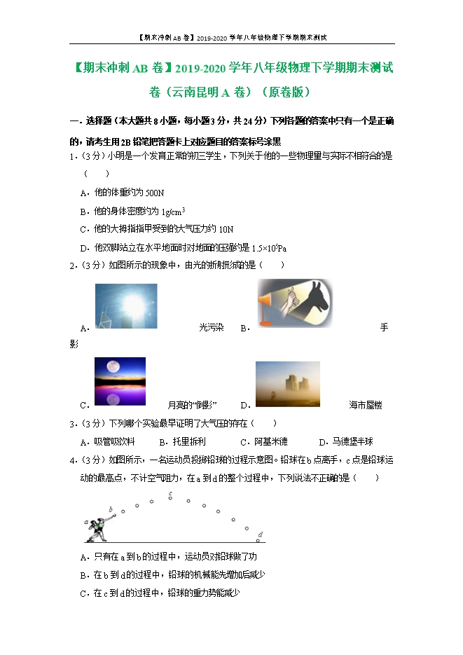 【内容简介】一.选择题(本大题共8小题,每小题3分,共24分)下列各题的答案中只有一个是正确的,请考生用2B铅笔把答题卡上对应题目的答案标号涂黑1.(3分)小明是一个发育正常的初三学生,下列关于他的一些物理量与实际不相符合的是( )A.他的体重约为500NB.他的身体密度约为1g/cm3C.他的大拇指指甲受到的大气压力约10ND.他双脚站立在水平地面时对地面的压强约是1.5×105Pa【答案】D【解析】A、一般初中生体重大约为50kg(100斤),重力G=mg=50kg×10N/kg=500N;符合实际;故A不符题意;B、人的密度与水的密度接近,即1g/cm3;故B不符题意;C、他的大拇指指甲的面积约1cm2,即1×10﹣4m2;大气压约为1×105Pa;故大拇指指甲受到的大气压力为:F=PS=1×105Pa×1×10﹣4m2=10N;故C不符题意;D、每只鞋的底面积大约为200cm2,即0.02m2;中学生的体重大约为50kg,压力F=G=mg=50kg×10N/kg=500N,压强P= = =1.25×104Pa;达不到1.5×105Pa;故D符合题意;故选:D。2.(3分)如图所示的现象中,由光的折射形成的是( )A. 光污染B. 手影C. 月亮的“倒影”D. 海市蜃楼【答案】D【解析】A、光污染是因为发生了镜面反射,是由于光的反射形成的,故A不符合题意;B、手影是由于光的直线传播形成的,故B不符合题意;C、月亮的“倒影”属于平面镜成像,是光的反射形成的现象,故C不符合题意;D、海市蜃楼是由于光的折射形成的,故D符合题意。故选:D。3.(3分)下列哪个实验最早证明了大气压的存在( )A.吸管吸饮料B.托里拆利C.阿基米德D.马德堡半球【答案】D【解析】A、吸管吸饮料是利用了大气压,故A错误。B、托里拆利实验准确测量大气压的值,故B错误。C、阿基米德原理是计算浮力的,故C错误;D、马德堡半球内抽成真空,两个半球在大气压的作用下,八对马费很大的力才拉开两个半球,这个实验证明大气压存在,并且大气压很大,故D正确。故选:D。4.(3分)如图所示,一名运动员投掷铅球的过程示意图。铅球在b点离手,c点是铅球运动的最高点,不计空气阻力,在a到d的整个过程中,下列说法不正确的是( ) A.只有在a到b的过程中,运动员对铅球做了功B.在b到d的过程中,铅球的机械能先增加后减少C.在c到d的过程中,铅球的重力势能减少D.在a到d的过程中,铅球的运动状态在不断的变化【答案】B【解析】A、在a到b的过程中,运动员对铅球有一个推力的作用且铅球在推力作用下移动了一段距离,所以在这个阶段,运动员对铅球做了功;铅球离开手,由于惯性继续运动,所以手就不做功了,故A正确;B、在b到d的过程中,由于不计空气阻力,所以铅球的机械能不变,故B错误;C、在c到d的过程中,铅球的质量不变,高度减小,故重力势能减小,故C正确;D、在a到d的过程中,铅球的运动方向和运动快慢都发生了改变,所以运动状态是在不断变化的,故D正确;故选:B。
