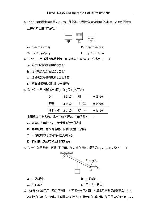所属专辑: 【期末冲刺AB卷】2019-2020学年八年级物理下学期期末测试卷