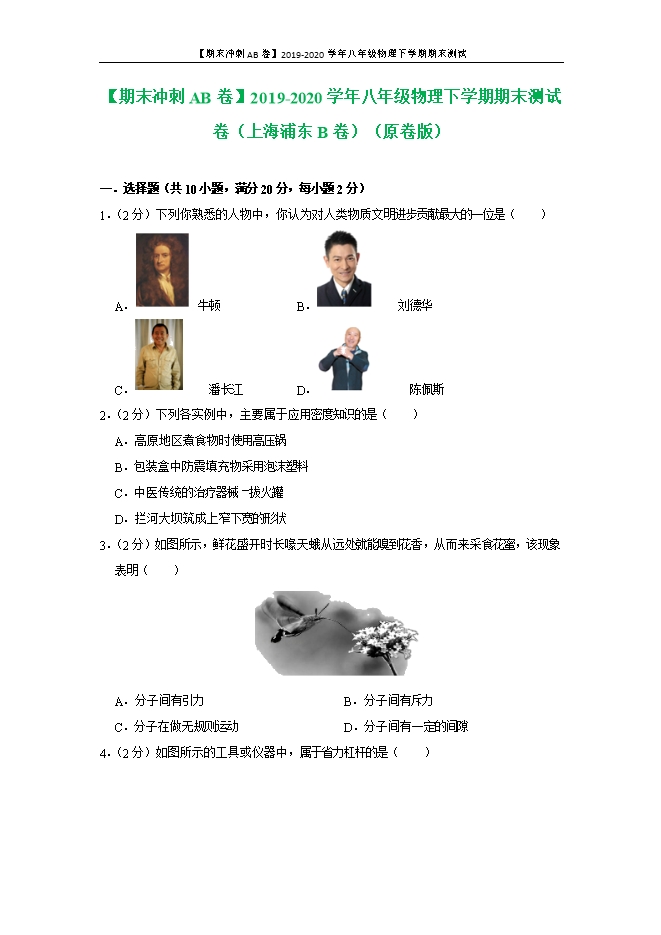 【内容简介】一.选择题(共10小题,满分20分,每小题2分)1.(2分)下列你熟悉的人物中,你认为对人类物质文明进步贡献最大的一位是( )A. 牛顿 B. 刘德华C. 潘长江 D. 陈佩斯【答案】A【解析】牛顿发现了万有引力定律,色散实验是有英国的物理学家牛顿首先研究的,第一架反射式望远镜诞生于1668年。牛顿经过多次磨制非球面的透镜均告失败后,决定采用球面反射镜作为主镜。他用2.5cm直径的金属,磨制成一块凹面反射镜,并在主镜的焦点前面放置了一个与主镜成45度角的反射镜,使经主镜反射后的会聚光经反射镜以90度角反射出镜筒后到达目镜。这种系统称为牛顿式反射望远镜,故对人类物质文明进步贡献最大的一位牛顿。故选:A。2.(2分)下列各实例中,主要属于应用密度知识的是( )A.高原地区煮食物时使用高压锅B.包装盒中防震填充物采用泡沫塑料C.中医传统的治疗器械﹣拔火罐D.拦河大坝筑成上窄下宽的形状【答案】B【解析】A、高压锅在使用时利用限压阀增大锅内气体压强,气压增大,水的沸点就会升高,故A不符合题意。B、相同体积的泡沫塑料与其它材料比较,由于泡沫塑料的密度较小,所以质量较小,适合做包装中的填充物,故B符合题意。C、拔火罐在使用时,由于燃烧,火罐内部的气压减小,小于外部大气压,所以火罐被压在皮肤上,其原理是利用了大气压,故C不符合题意,D、水坝筑成下宽、上窄的形状,是考虑到水对坝体侧面有压强,并且水的压强随深度的增加而增大,故D不符合题意。故选:B。3.(2分)如图所示,鲜花盛开时长喙天蛾从远处就能嗅到花香,从而来采食花蜜,该现象表明( ) A.分子间有引力B.分子间有斥力C.分子在做无规则运动D.分子间有一定的间隙【答案】C【解析】长喙天蛾嗅到花香,是因为花香分子在不停地做无规则运动,属于扩散现象。故选:C。4.(2分)如图所示的工具或仪器中,属于省力杠杆的是( )A. 行李车B. 晾衣竹竿C. 天平D. 脚踏板【答案】A【解析】由图可知晾衣竹竿、脚踏板的动力臂都小于阻力臂,属于费力杠杆;天平的动力臂等于阻力臂,属于等臂杠杆。只有行李车的动力臂大于阻力臂,属于省力杠杆。所以选项B、C、D都不符合题意。故选:A。5.(2分)生物体内水的比例很高,有助于调节生物体自身的温度,以免温度变化太快对生物体造成损害。这主要是因为水的( )A.密度大B.凝固点较低C.沸点较高D.比热容较大【答案】D【解析】因为水的比热容比较大,在吸收或放出相同的热量时,水的温度变化小,因此生物体内水的比例很高,有助于调节生物体自身的温度,以免温度变化太快对生物体造成损害。故选:D。6.(2分)把相同质量的酒精、水、盐水分别注入完全相同的三个杯子里,已知ρ盐水>ρ水>ρ酒精,则液面最高的是( )A.酒精B.水C.盐水D.无法判断【答案】A【解析】由题知,ρ盐水>ρ水>ρ酒精,水、酒精、盐水的质量相同,由ρ= 可知酒精的体积最大,分别注入完全相同的三个杯子里,所以酒精的液面最高。故选:A。7.(2分)下列功率的说法中,正确的是( )A.物体做功越多,功率越大B.物体做功越短,功率越大C.物体做功越快,功率越大D.物体做功越长,功率越大【答案】C【解析】功率是表示做功快慢的物理量,在同样的时间内,做功越多,即做功越快,功率越大,故C正确,故ABD错误。故选:C。