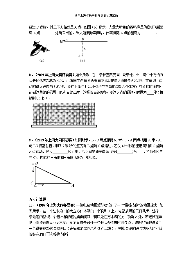 【内容简介】一、单项选择题1、(2018年上海大同杯复赛)钱塘江大潮天下闻名。假设起潮时在江面形成前后两个潮涌(可以视作水波),以恒定速度v向防波堤前进,如图所示。两个潮涌的高度均为A,两个潮涌的间距为a。t=0时,靠近防波堤的潮涌波峰抵达C处,C点到防波堤的距离为a。已知潮涌碰到防波堤返回后,高度减为原来的一半,则经过时间t=2a/v,在C处形成波峰的高度为( )A.0B.A/2C.AD.3A/2 2、(2016年上海大同杯复赛)如图所示,水波从A点产生,被墙面所反射,其反射波可以等效看作是从空间某点发出的波,该点所在的位置是图中的( )A.A点 B.B点 C.C点 D.D点 3、(2010年上海大同杯初赛)“蜻蜓点水”是常见的自然现象,蜻蜓点水后在平静的水面上会出现波纹.某同学在研究蜻蜓运动的过程中获得了一张蜻蜓点水的俯视照片,照片反映了蜻蜓连续三次点水后某瞬间的水面波纹.如果蜻蜓飞行的速度恰好与水波的传播速度相等,不考虑蜻蜓每次点水所用的时间,在下列四幅图中,与照片相吻合的是( ) 4、(2004年上海大同杯初赛)水滴从空中落到平静的水面后再弹起,如图所示的是对这一过程拍摄的部分镜头,则按时间由先到后的排序应该是( ) A.①②③⑤④ B.⑤①②③④ C.③⑤④①② D.②③⑤④①二、多项选择题5、(2015年上海大同杯初赛)Ll、L2两条马路呈“丁”字形,B点为路口,两条路上有A、C两点,如图所示.甲、乙两人分别从C、B两点同时出发,并分别以速度v1、v2(v1≠v2)沿Ll、L2两条路做匀速直线运动,某时刻甲、乙两人各自所处的位置和B点所形成的三角形恰好与三角形ABC相似,这样的时刻( )(多选) A.最少一个 B.最少两个C.最多三个 D.最多四个6、(2014年上海大同杯初赛)AB是一条平直公路边上的两块路牌,一只小鸟和一辆小车同时分别由A、B两路牌相向运动,小鸟飞到小车正上方立即以同样大小的速度折返飞回A并停留在路牌处;再过一段时间,小车也行驶到A.它们的位置与时间的关系如图所示,图中t2=2t1.则( )(多选) A.小鸟与汽车速度大小之比为2∶1B.从出发到相遇这段时间内,小鸟与汽车通过的路程之比为3∶1C.小鸟到达A时,汽车到达AB中点D.小鸟与汽车通过的总路程之比为3∶1三、填空题7、(2010年上海大同杯初赛)如图(a)所示的是代号为“黑鸟SR﹣71”的战略侦察机.该侦察机以两倍音速在距离地面高度为L的高空水平飞行,某人站在地面上A点,当侦察机经过D点时,其正下方恰好是A点,如图(b)所示.人最先听到的轰鸣声是侦察机飞到距离A点_________处所发出的,当人听到该声音时,侦察机离A点的距离为_________.