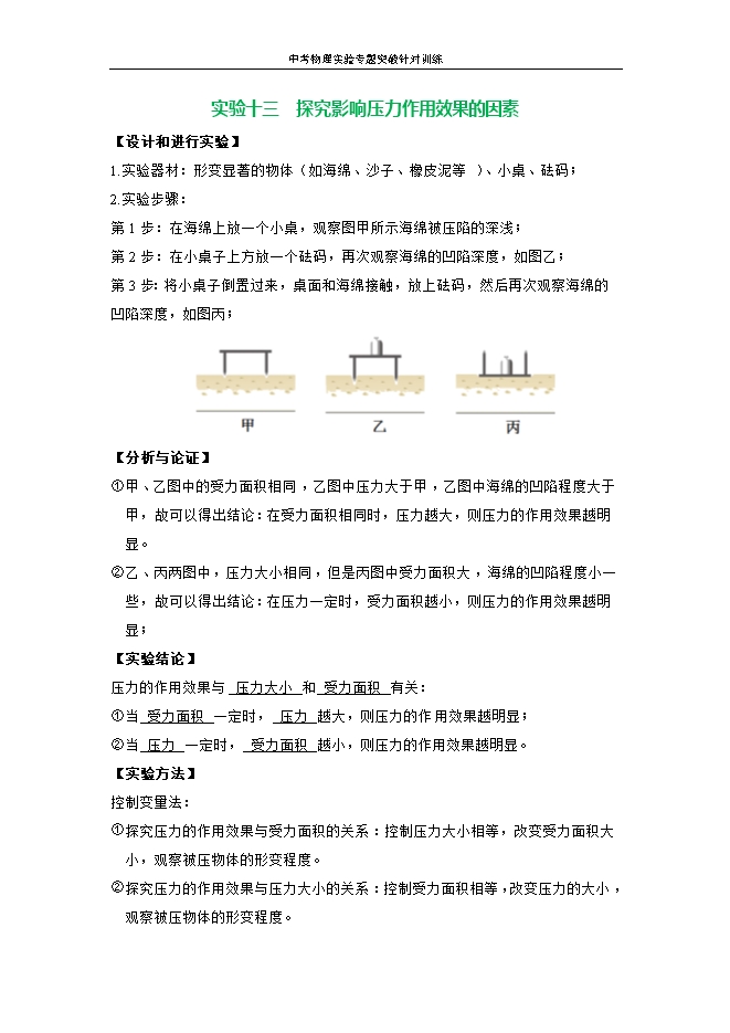 中考物理实验专题突破针对训练:实验13 探究影响压力作用效果的因素