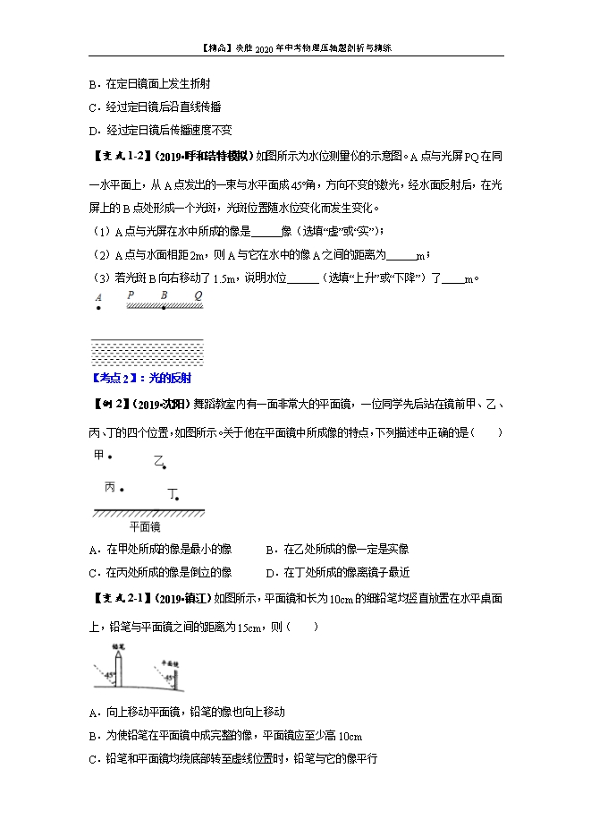 【内容简介】【考点1】:光的直线传播【例1】(2019•随州)一篇科普文章中写道,即使太阳突然消失,人类也不能“第一时间”发现,因为尽管阳光信使一路狂奔,当他来到我们面前时已经过去8.333333分钟!据此估算太阳与地球之间的距离最接近下列选项中的( ) A.1.5亿千米B.150亿千米C.15×108mD.1.5×1011km【考点】光的传播速度与光年. 【答案】A【解析】8.333333分钟≈500s,因为v= ,所以太阳与地球之间的距离为s=vt=3×108m/s×500s=1.5×1011m=1.5亿千米。【点拔】此题考查了速度变形公式的应用,注意科学记数法的正确应用。【变式1-1】(2019•金华)我国建成全球规模最大熔盐塔式光热电站,如图是利用大规模阵列抛物镜面收集太阳能的工作原理图。下列关于太阳光传播的说法错误的是( ) A.在定日镜面上发生反射B.在定日镜面上发生折射C.经过定日镜后沿直线传播D.经过定日镜后传播速度不变【考点】1.光在均匀介质中直线传播;2.光的传播速度与光年;3.光的反射现象. 【答案】B【解析】AB、太阳发出的光从空气照射到定日镜面上时会发生反射,但没有从一种介质进入另一种介质,不会发生折射,故A正确,B错误;C、光在同种、均匀、透明介质中沿直线传播,所以经过定日镜后光沿直线传播,故C正确;D、一般情况下,光在同种介质中传播速度不变,所以光经过定日镜后传播速度不变。故D正确。【点拔】此题通过塔式光热电站考查学生对光的直线传播、光的反射和光的折射的理解,在学习过程中要注意区分几种光现象,并善于利用所学知识解释有关现象。【变式1-2】(2019•呼和浩特模拟)如图所示为水位测量仪的示意图。A点与光屏PQ在同一水平面上,从A点发出的一束与水平面成45°角,方向不变的激光,经水面反射后,在光屏上的B点处形成一个光斑,光斑位置随水位变化而发生变化。(1)A点与光屏在水中所成的像是 像(选填“虚”或“实”);(2)A点与水面相距2m,则A与它在水中的像A′之间的距离为 m;(3)若光斑B向右移动了1.5m,说明水位 (选填“上升”或“下降”)了 m。 【考点】1.光的直线传播;2.光的反射定律的应用. 【答案】(1)虚;(2)4;(3)下降;0.75。......