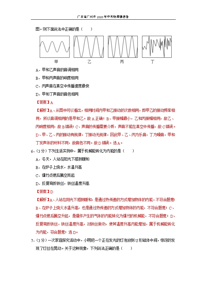 【内容简介】一.选择题(共16小题,满分32分,每小题2分)1.(2分)我们的生活越来越离不开电,下列用于发电的能源属于可再生的是(  )A.风能和核能B.风能和煤的化学能C.风能和水能D.煤的化学能和核能【答案】C【解析】在选项所给能源中,风能、水能可以从自然界里源源不断的得到补充,属于可再生能源;而煤的化学能、核能不能短时期内从自然界得到补充,属于不可再生能源;故C正确,ABD错误。故选:C。2.(2分)下列物品中,通常属于导体的是(  )A.塑料布B.玻璃板C.食盐水D.空气【答案】C【解析】容易导电的物体为导体,不容易导电的物体为绝缘体。塑料布、玻璃板、空气不容易导电,是绝缘体;食盐水容易导电,是导体。故C正确。故选:C。3.(2分)下列各图中,能正确描述铁锭熔化成铁水过程中,温度随时间变化情况的是(  )A. B. C. D. 【答案】B【解析】A、图中温度随时间而不断升高,是非晶体的熔化图象,故A错误;B、图中温度随时间而升高,且有一段呈水平,是铁锭在熔点温度时熔化,故B正确;C、图中温度随时间而降低,是非晶体的凝固图象,故C错误;D、读图可知,温度随时间而降低,且有一段呈水平,是晶体的凝固图象,故D错误。故选:B。4.(2分)下列四种做法中,符合安全用电原则的是(  )A.用湿抹布擦拭电灯B.在高压线附近放风筝C.发生触电事故后,先切断电源再救人D.将控制灯泡的开关安装在灯泡和零线之间【答案】C【解析】A、一般的水是导体,用湿抹布擦拭带电的电灯时,可能会因湿抹布导电而发生触电事故。不符合题意;B、禁止在高压线附近放风筝,以免触电,故C不符合题意;C、发生触电事故后,先切断电源再救人,以免再次发生触电事故,故C符合题意;D、开关安在火线和用电器之间,以免触电,故D符合题意。故选:C。5.(2分)小明乘坐动车时,看到桌面上的苹果保持静止不动,则他所选的参照物是(  )A.铁轨B.桌面C.路旁的树木D.从旁边走过的列车员......