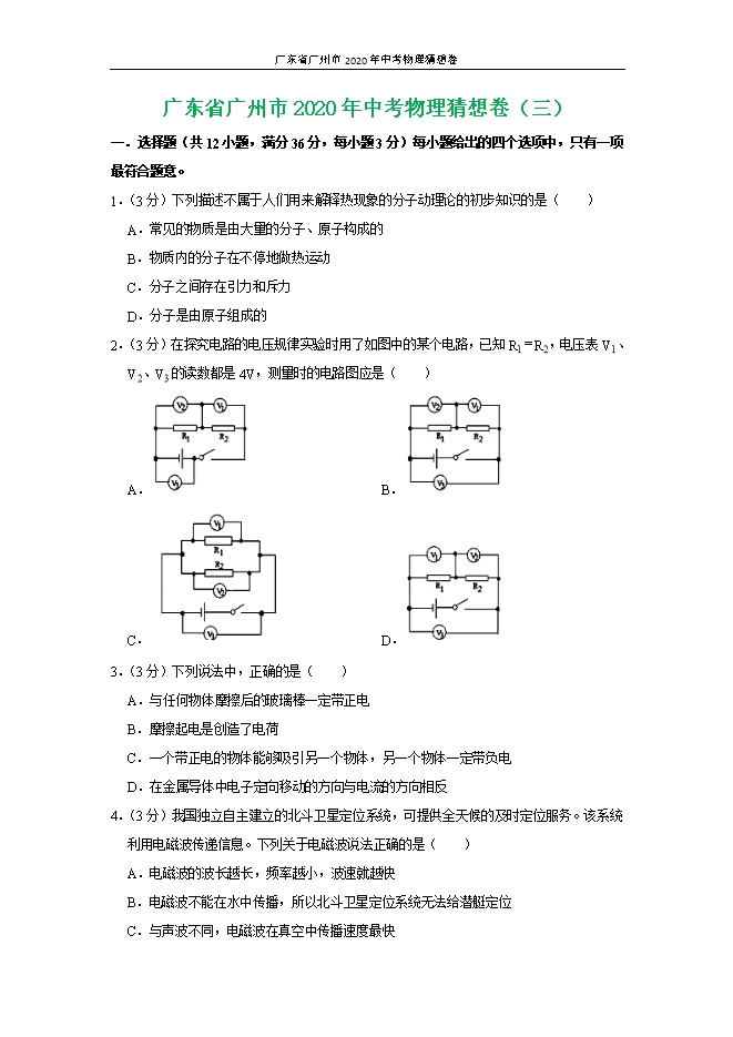 广东省广州市2020年中考物理猜想卷(三)(原卷版和解析版)