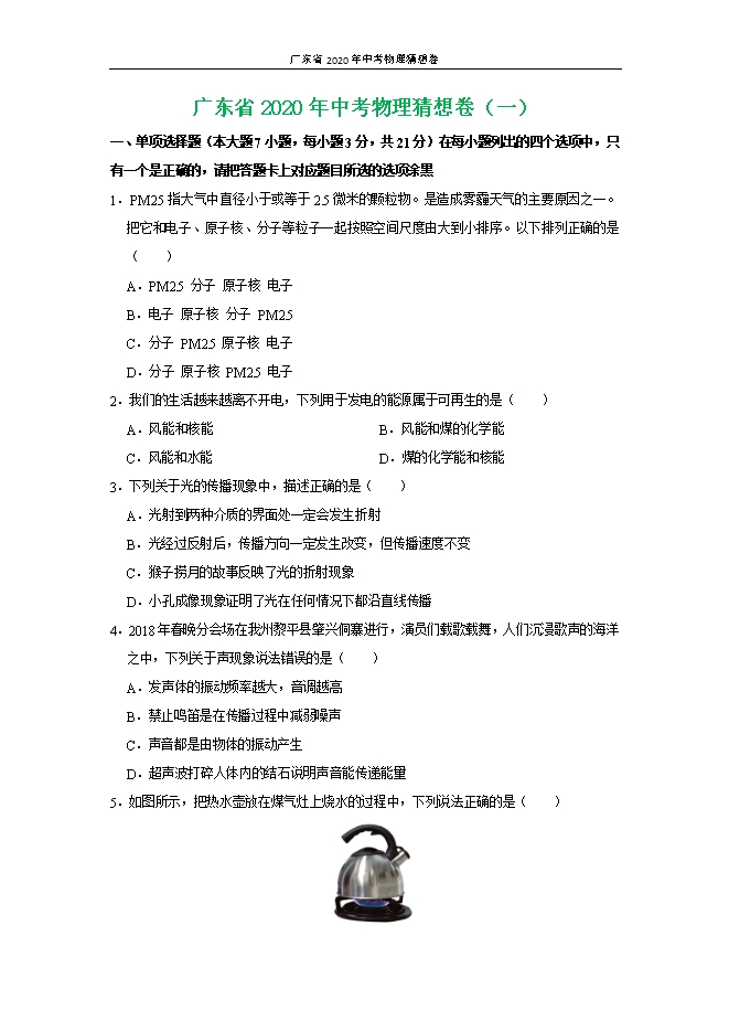 河北省2020年中考物理猜想卷(三)(原卷版和解析版)