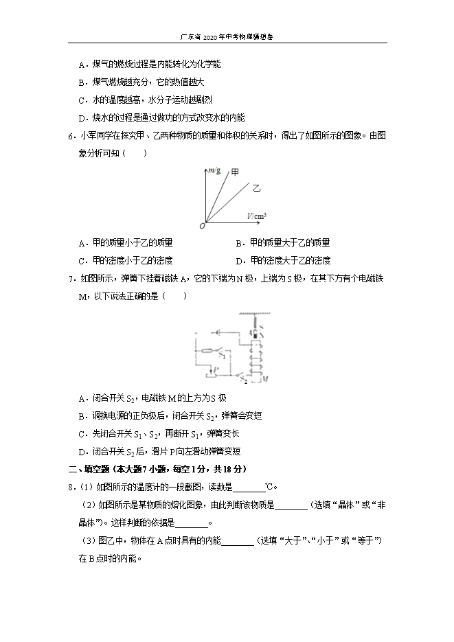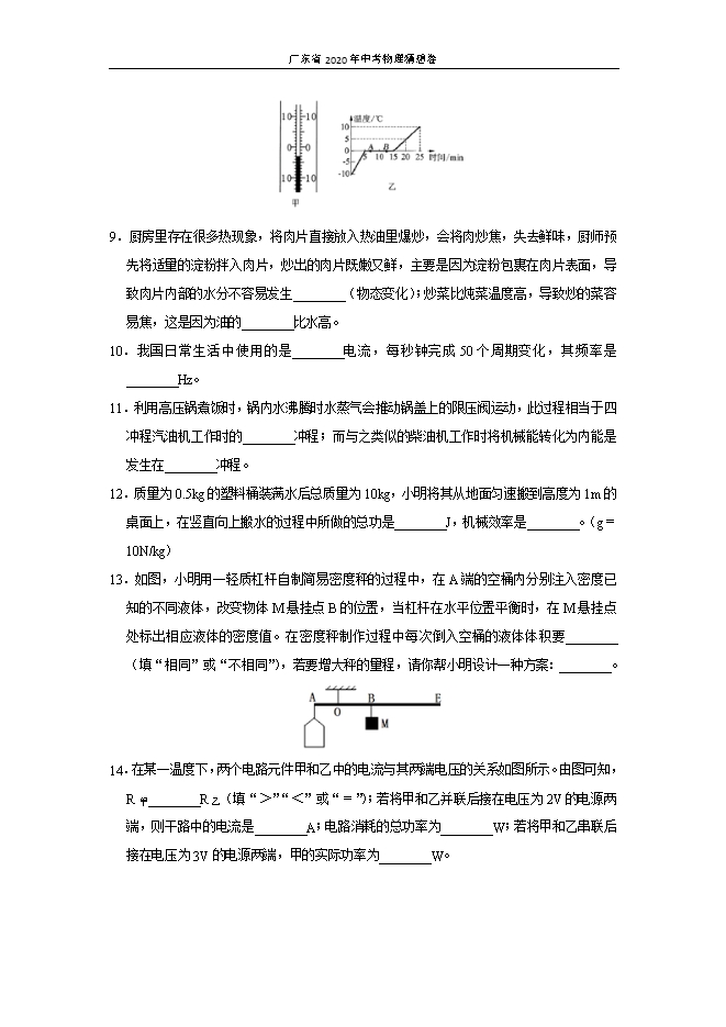 【内容简介】河北省2020年中考物理猜想卷(三)一、选择题(本大题共9个小题,共21分.1-6小题为单选题,每小题的四个选项中,只有一个选项符合题意,每小题2分;7-9小题为多选题,每小题的四个选项中,有两个或两个以上选项符合题意,每小题2分,全选对的得3分,选对但不全的得2分,有错选或不选的不得分) 1.(2分)下列估测与实际情况相符的是(  )A.一位中学生的质量约为500gB.一节物理课的时间约为45sC.一张课桌的高度约为75cmD.人感觉舒适的环境温度约为37℃【答案】C【解析】A、一位中学生的质量约为50kg,此选项不符合实际;B、一节物理课的时间约为45min,此选项不符合实际;C、一张课桌的高度约为75cm,此选项符合实际;D、人体感觉最舒适的温度约为23℃,此选项不符合实际。选C。2.(2分)关于声音和电磁波,下列说法正确的是(  )A.一切发声的物体都在振动B.人们小声说话时,声音的音调一定低C.声和电磁波都能传递信息,且都可以在真空中传播D.公路旁安装“声障墙”是为了在声源处减弱噪声【答案】A【解析】A、声音是发声体的振动产生的,一切发声的物体都在振动。故A正确;B、小声说话时,响度较小,音调不一定低,因为音调与振动频率有关。故B错误;C、声音和电磁波都能传递信息,但声音传播需要介质,真空不能传声;电磁波传播不需要介质,可以在真空中传播。故C错误;D、公路旁安装“声障墙”是在传播过程中减弱噪声。故D错误。选A。3.(2分)将杯中的液态氮(沸点为﹣196℃)倒入盛有奶浆的碗制作冰淇淋,观察到杯中液态氮沸腾,杯外壁出现白霜,则(  )A.杯中液态氮放热B.杯中液态氮温度不断上升......