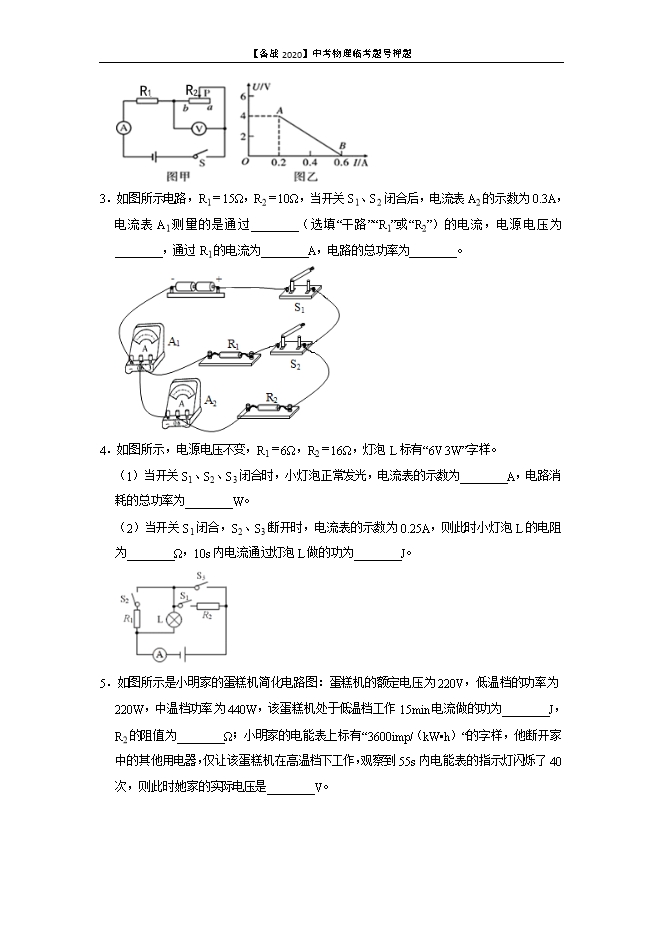 【内容简介】如图电路中,U=12V,R1=6Ω,R2=3Ω,R3=4Ω.当S2断开,S1闭合时,电阻R1消耗的电功率为________W;当S1、S2都闭合时,6s内电流通过R2产生的热量是________J。 【答案】8.64;32。【解析】(1)当S2断开,S1闭合时,电阻R1和R3串联,电路的电流:I= = =1.2A,电阻R1消耗的电功率:P=I2R1=(1.2A)2×6Ω=8.64W;(2)当S1、S2都闭合时,电阻R1和R2先并联,再和R3串联,R1和R2并联的总电阻:R= = =2Ω,干路中的电流:I′= = =2A,则电阻R2两端的电压:U2=I′R=2A×2Ω=4V,6s内电流通过R2产生的热量:Q=W= t= ×6s=32J。 如图甲所示,闭合开关S,调节滑动变阻器的滑片从最右端滑至灯正常发光的位置,电流表示数与两电压表示数的关系图象如图乙所示。则电源电压为________V,灯的功率变化量为________W。 【答案】4.5;1。【解析】由电路图可知,灯泡L与滑动变阻器R串联,电压表V1测L两端电压,电压表V2测滑动变阻器两端电压,电流表测电路中的电流。(1)当滑片位于最右端时,接入电路中的电阻最大,此时电路中的电流最小,并且滑动变阻器分得的电压最大,因此根据图乙可知,此时电路电流为0.1A,灯泡两端电压为0.5V,滑动变阻器两端电压为4V;此时灯泡的功率PL1=UL1Imin=0.5V×0.1A=0.05W;因串联电路两端电压等于各部分电压之和,所以电源电压:U=UL1+U滑=0.5V+4V=4.5V;(2)根据题意可知,当电流表示数最大时,灯泡正常发光,由图乙可知,此时电路电流为0.3A,滑动变阻器两端电压为1V,因串联电路两端电压等于各部分电压之和,所以灯泡的额定电压:UL=U﹣U滑′=4.5V﹣1V=3.5V,......
